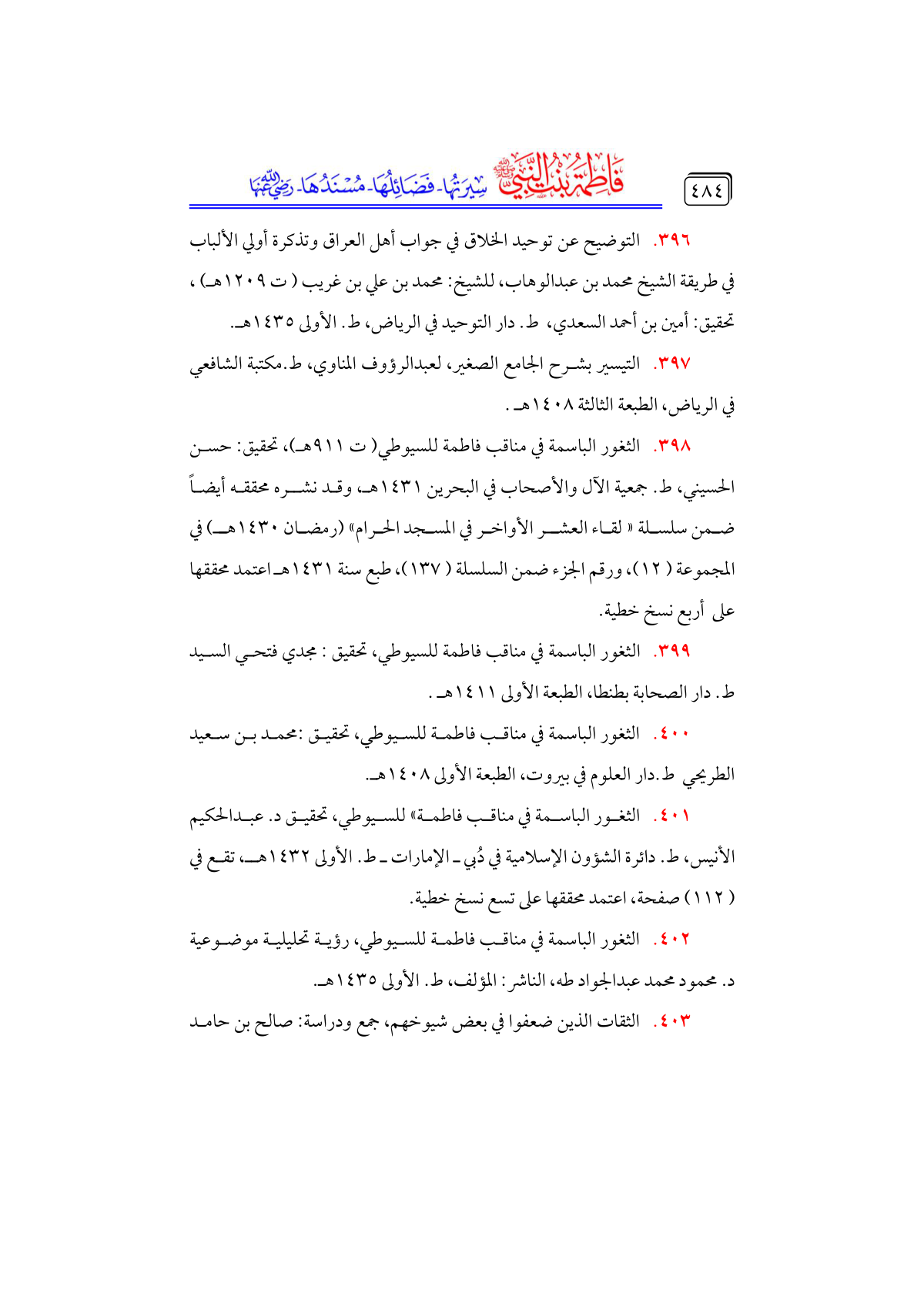 • الثغور الباسمة في مناقب فاطمة» للسيوطي، تحقيق د. عبدالحكيم الأنيس، ط. دائرة الشؤون الإسلامية في دُبي ـ الإمارات ـ ط. الأولى ١٤٣٢ هـ، تقع في ... (١١٢) صفحة، اعتمد محققها على تسع نسخ خطية.