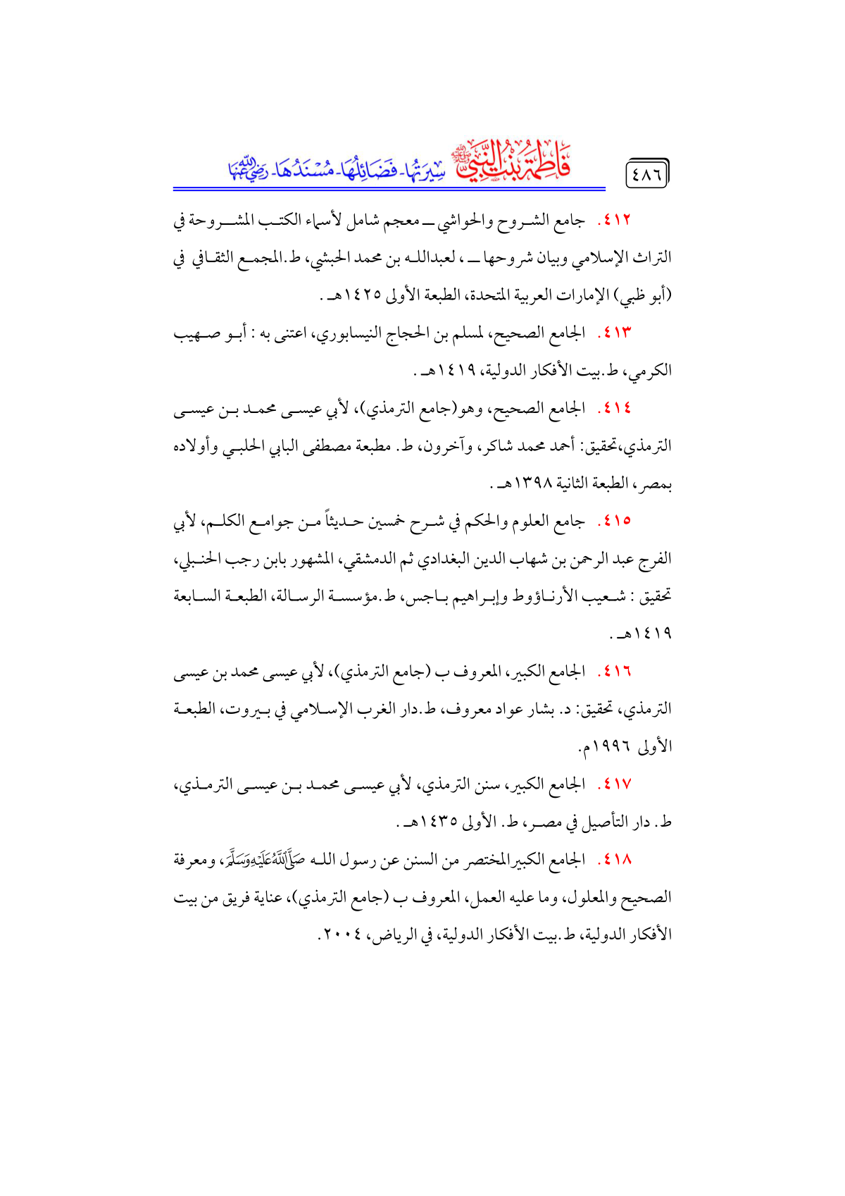 • الجامع الكبير، المعروف ب (جامع الترمذي)، لأبي عيسى محمد بن عيسى الترمذي، تحقيق: د. بشار عواد معروف، ط. دار الغرب الإسلامي في بيروت، الطبعة الأولى ١٩٩٦ م.