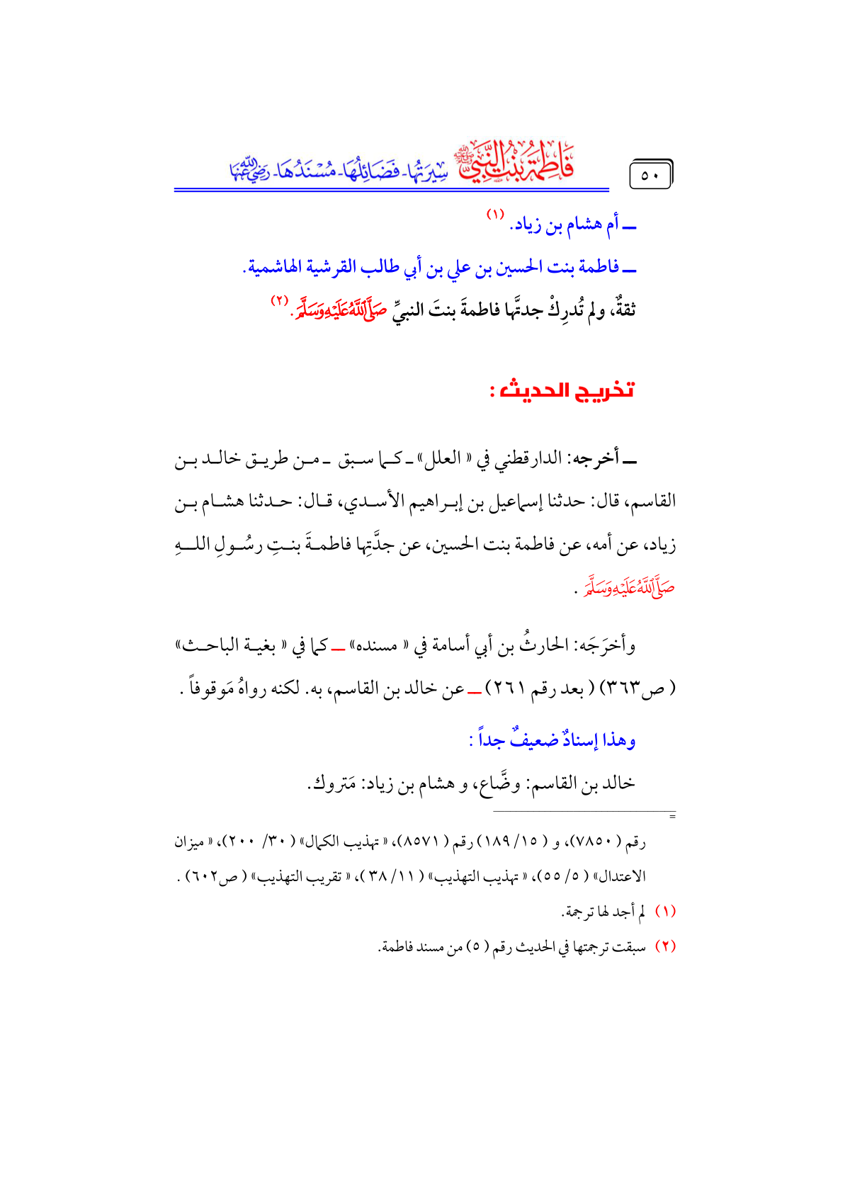 ــ أخرجه: الدارقطني في «العلل» ـ كما سبق ـ من طريق خالد بن القاسم، قال: حدثنا إسماعيل بن إبراهيم الأسدي، قال: حدثنا هشام بن زياد، عن أمه، عن فاطمة بنت الحسين، عن جدَّتِها فاطمةَ بنتِ رسُولِ اللهِ - صلى الله عليه وسلم -.