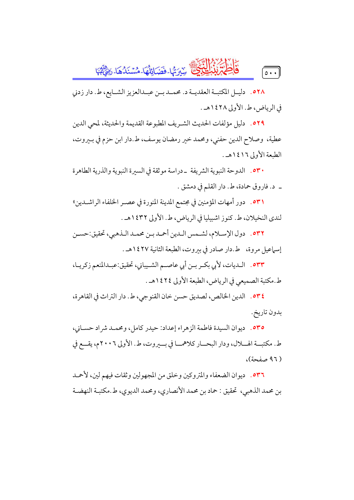 • ديوان السيدة فاطمة الزهراء إعداد: حيدر كامل، ومحمد شراد حساني، ط. مكتبة الهلال، ودار البحار كلاهما في بيروت، ط. الأولى ٢٠٠٦ م، يقع في ... (٩٦ صفحة)،