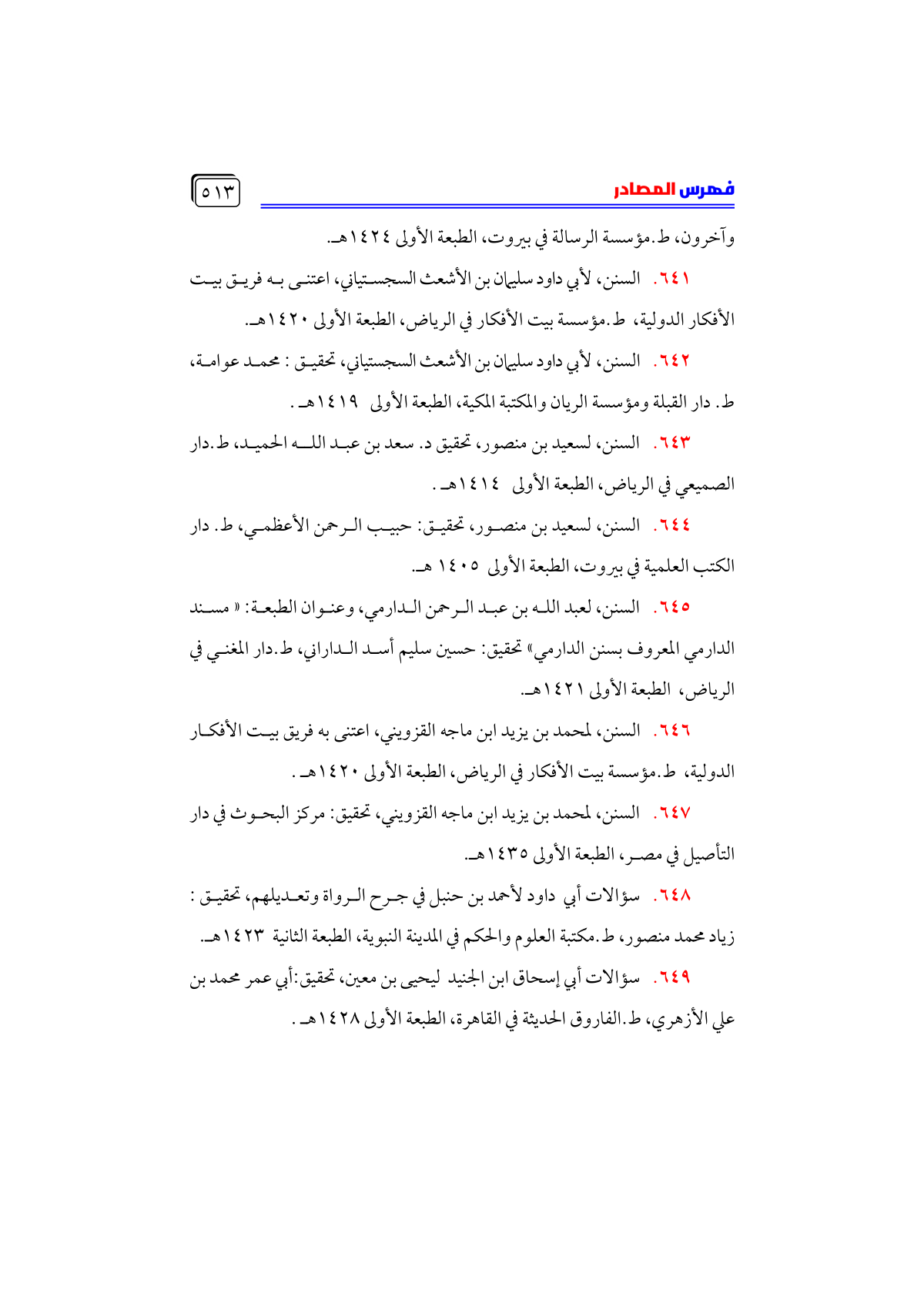 • السنن، لمحمد بن يزيد ابن ماجه القزويني، تحقيق: مركز البحوث في دار التأصيل في مصر، الطبعة الأولى ١٤٣٥ هـ.