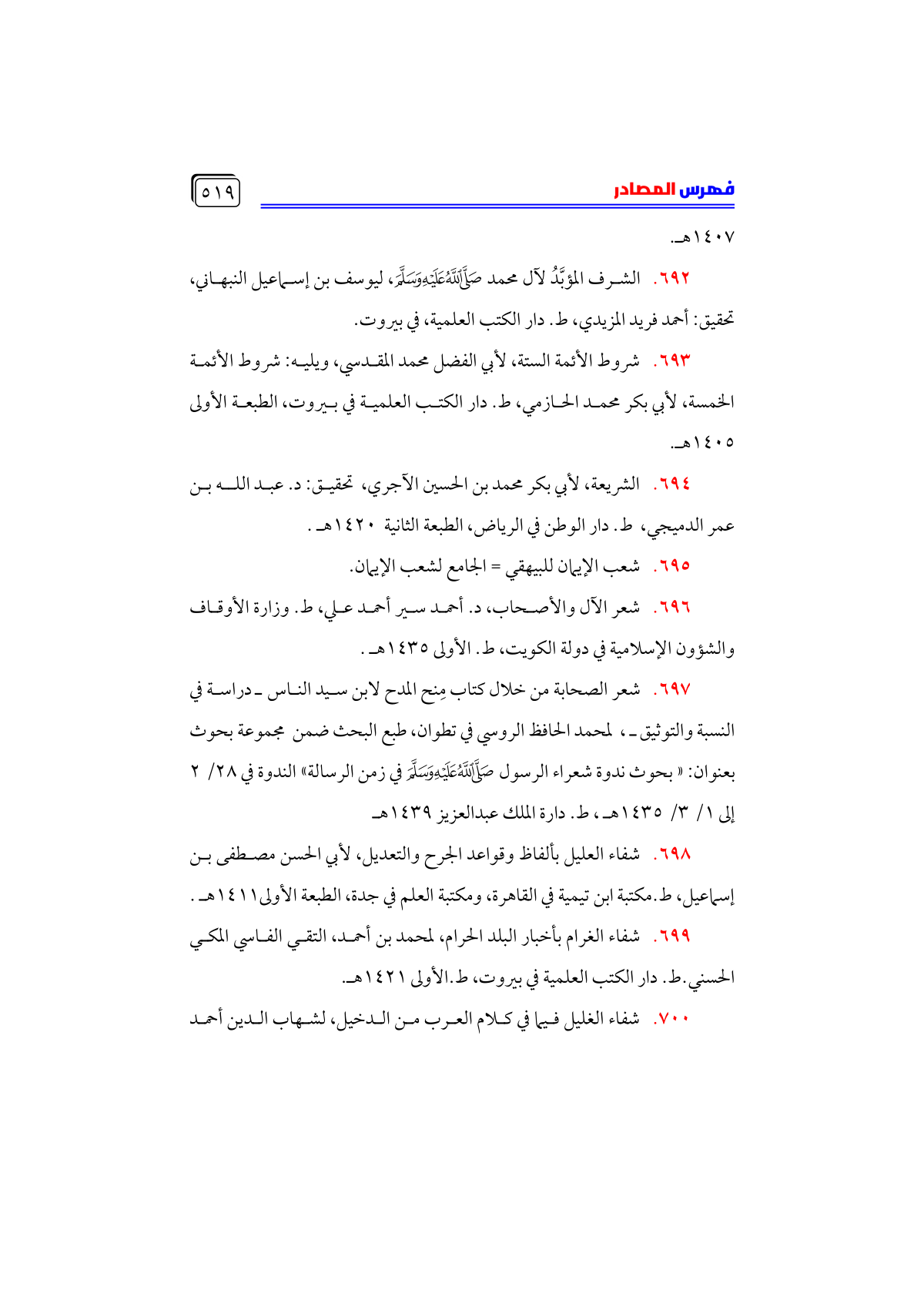 • الشرف المؤبَّدُ لآل محمد - صلى الله عليه وسلم -، ليوسف بن إسماعيل النبهاني، تحقيق: أحمد فريد المزيدي، ط. دار الكتب العلمية، في بيروت.