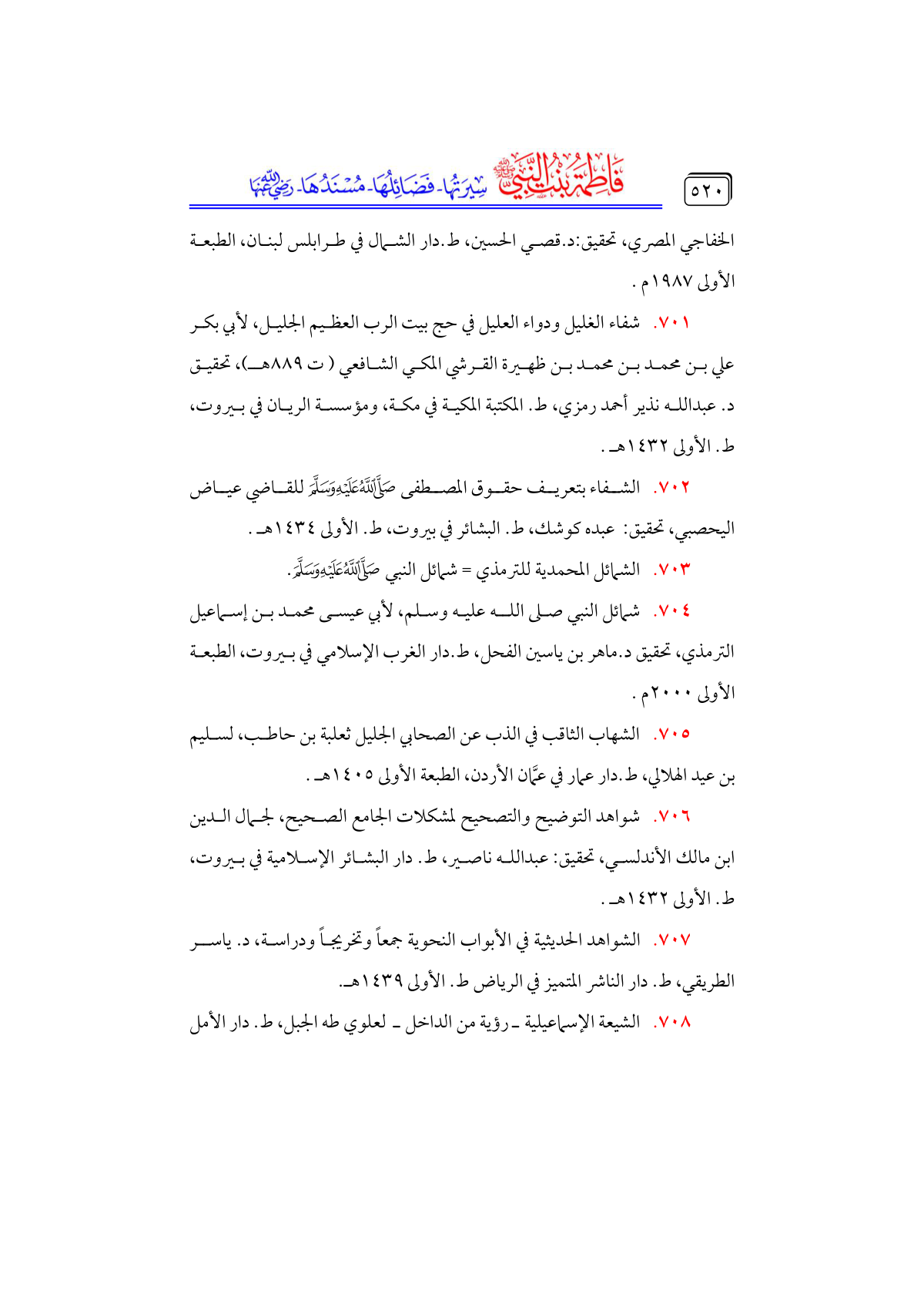 • شمائل النبي صلى الله عليه وسلم، لأبي عيسى محمد بن إسماعيل الترمذي، تحقيق د. ماهر بن ياسين الفحل، ط. دار الغرب الإسلامي في بيروت، الطبعة الأولى ٢٠٠٠ م.
