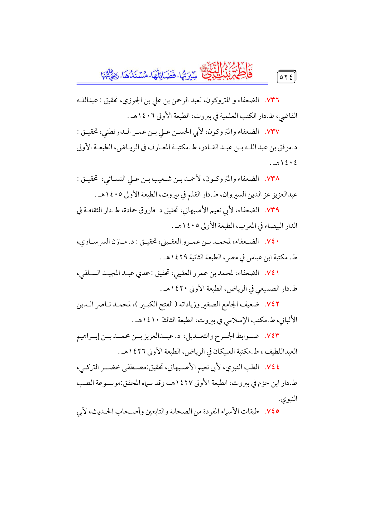 • الضعفاء، لأبي نعيم الأصبهاني، تحقيق د. فاروق حمادة، ط. دار الثقافة في الدار البيضاء في المغرب، الطبعة الأولى ١٤٠٥ هـ.