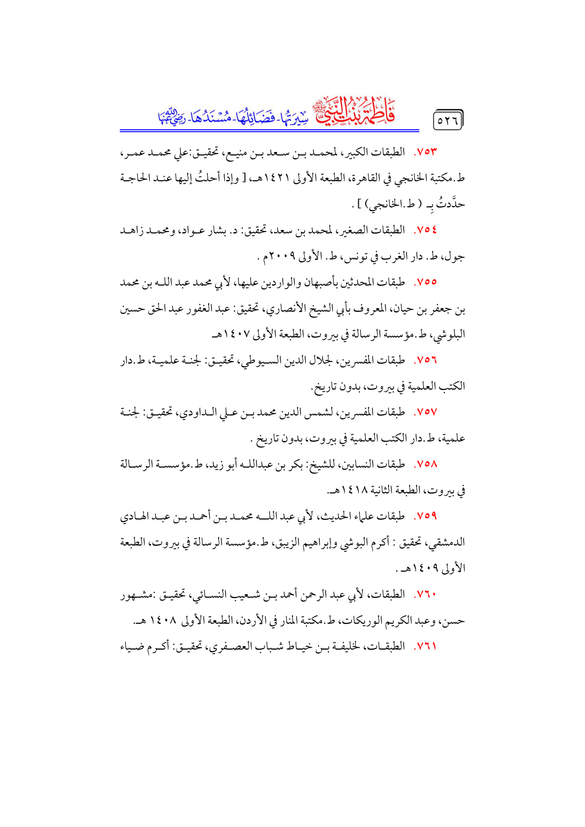 • الطبقات الكبير، لمحمد بن سعد بن منيع، تحقيق: علي محمد عمر، ط. مكتبة الخانجي في القاهرة، الطبعة الأولى ١٤٢١ هـ، [وإذا أحلتُ إليها عند الحاجة حدَّدتُ بِـ (ط. الخانجي)].