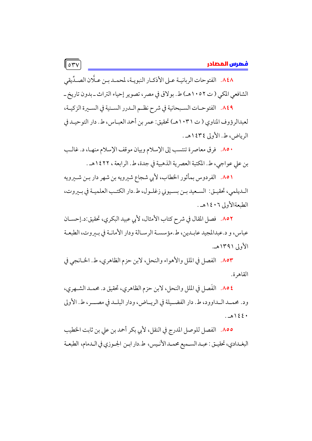 • الفَصل في الملل والنحل، لابن حزم الظاهري، تحقيق د. محمد الشهري، ود. محمد الداوود، ط. دار الفضيلة في الرياض، ودار البلد في مصر، ط. الأولى ١٤٤٠ هـ.