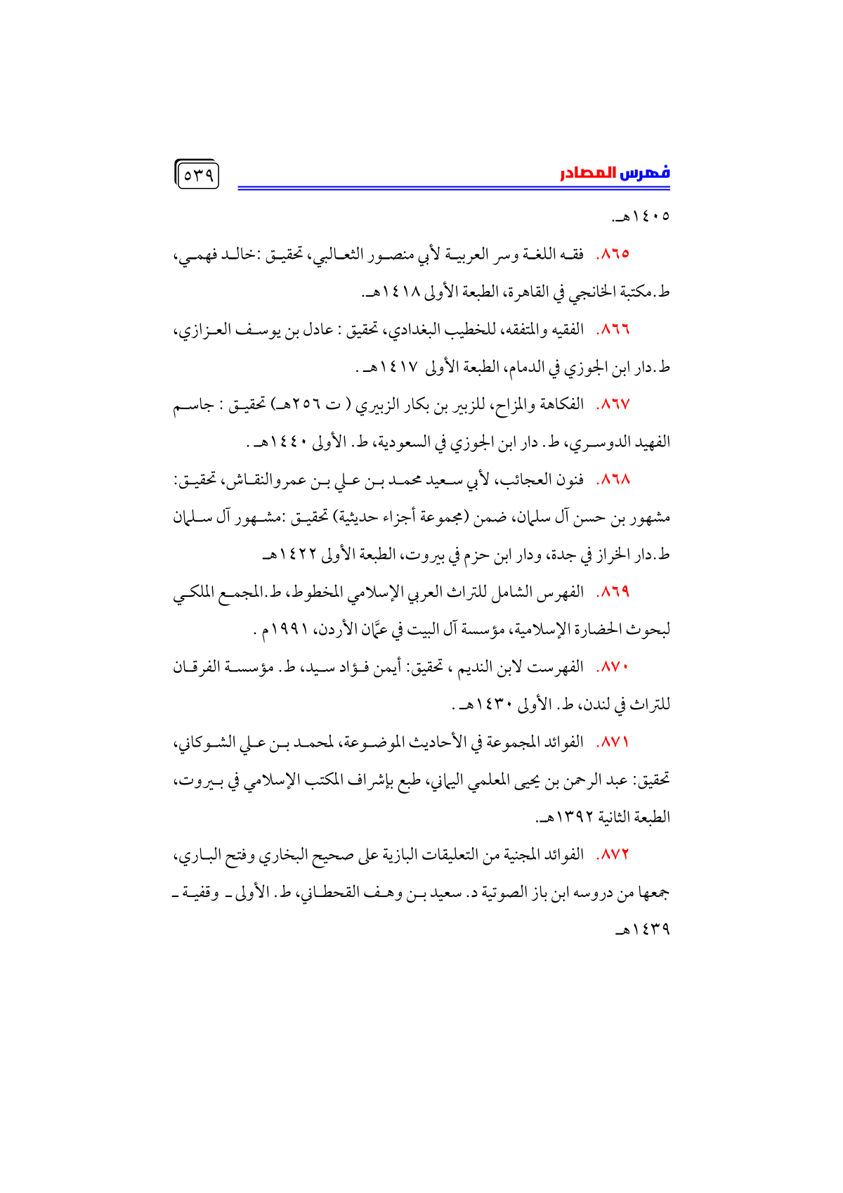 • فقه اللغة وسر العربية لأبي منصور الثعالبي، تحقيق: خالد فهمي، ط. مكتبة الخانجي في القاهرة، الطبعة الأولى ١٤١٨ هـ.