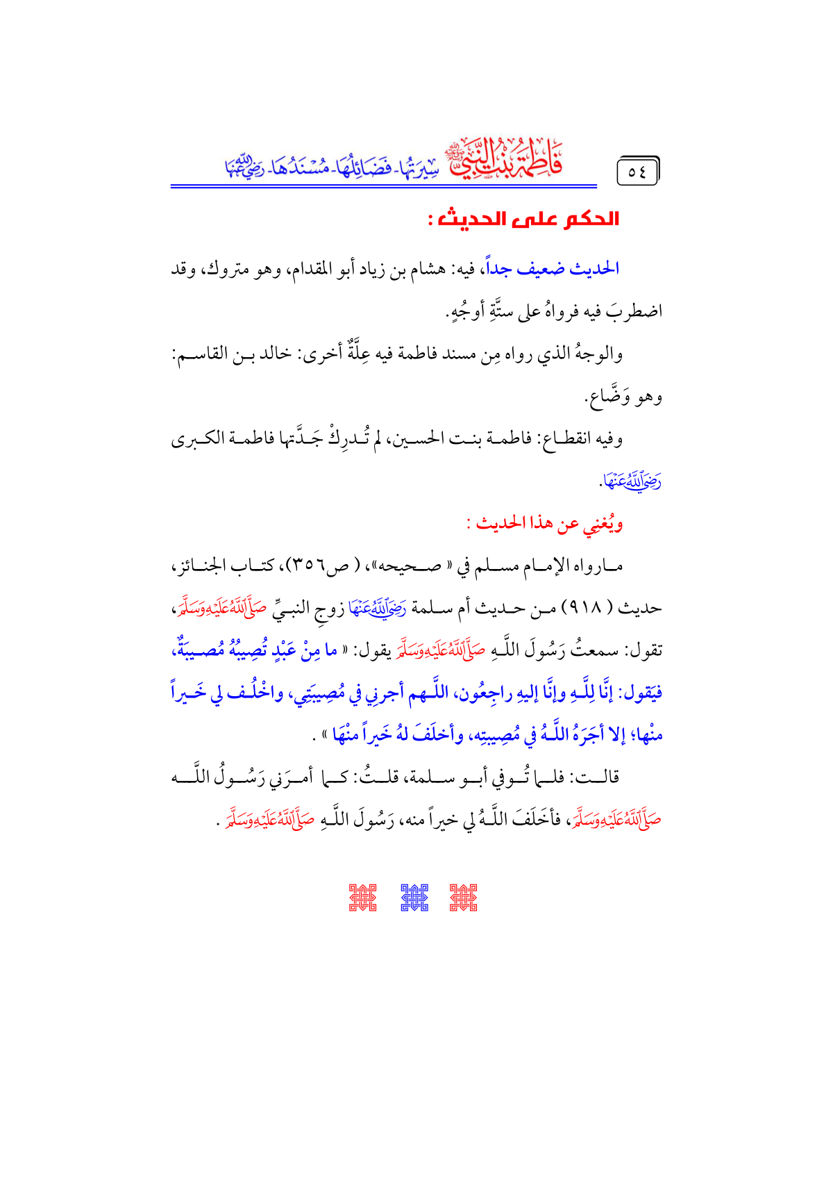 وفيه انقطاع: فاطمة بنت الحسين، لم تُدرِكْ جَدَّتها فاطمة الكبرى - رضي الله عنها -.