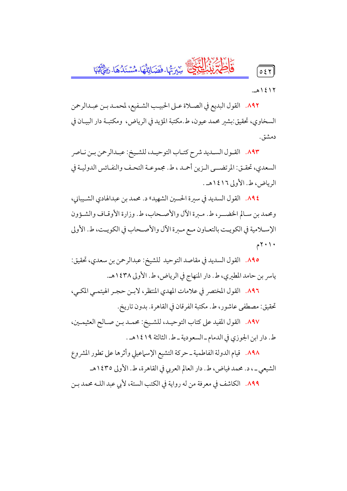 • القول السديد شرح كتاب التوحيد، للشيخ: عبدالرحمن بن ناصر السعدي، تحقق: المرتضى الزين أحمد، ط. مجموعة التحف والنفائس الدولية في الرياض، ط. الأولى ١٤١٦ هـ.