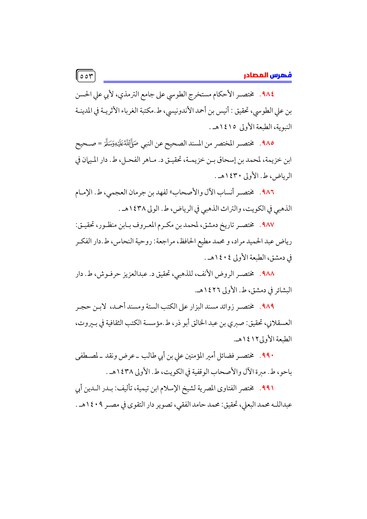• مختصر المختصر من المسند الصحيح عن النبي - صلى الله عليه وسلم - = صحيح ابن خزيمة، لمحمد بن إسحاق بن خزيمة، تحقيق د. ماهر الفحل، ط. دار الميمان في الرياض، ط. الأولى ١٤٣٠ هـ.