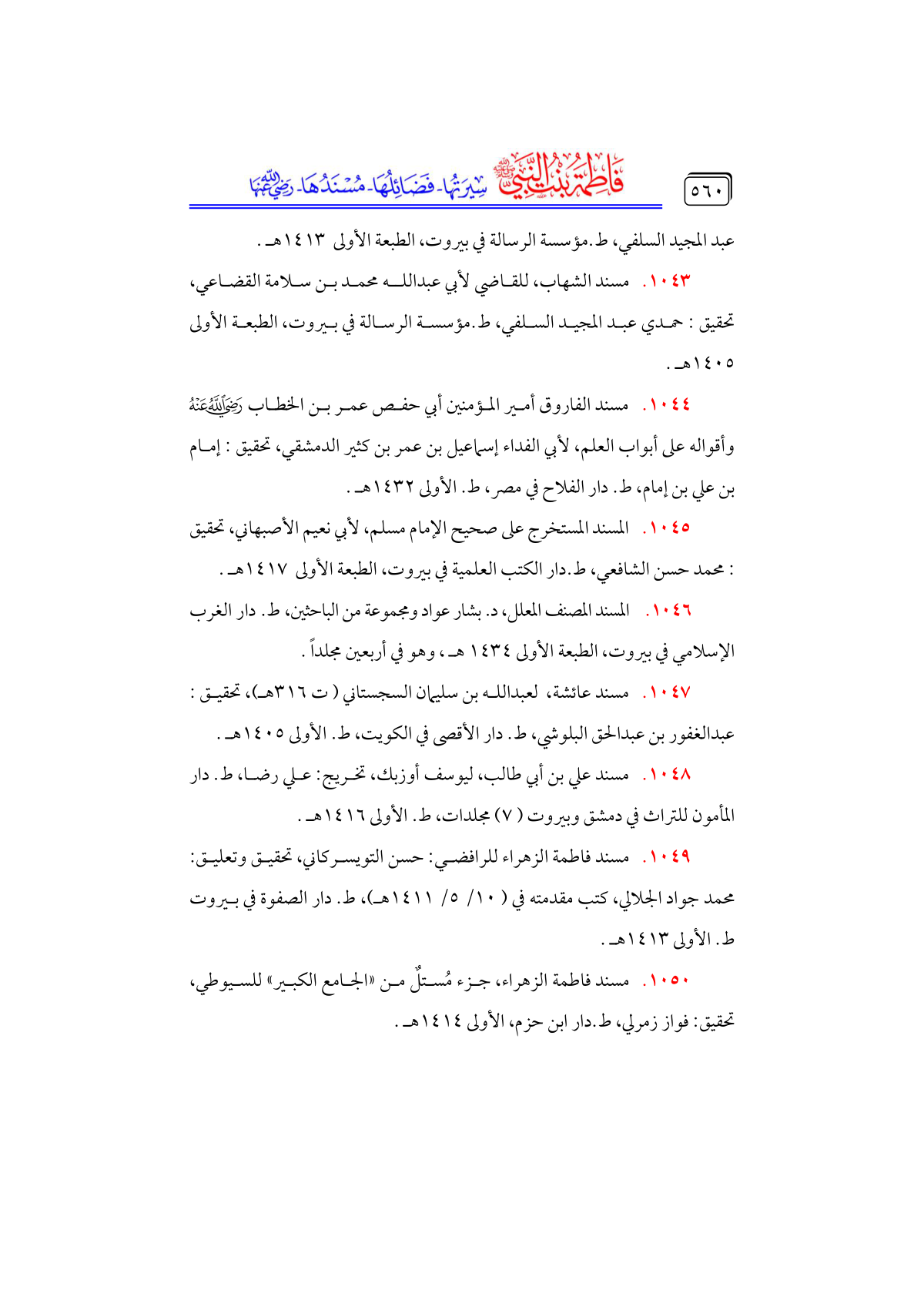 • مسند فاطمة الزهراء، جزء مُستلٌ من «الجامع الكبير» للسيوطي، تحقيق: فواز زمرلي، ط. دار ابن حزم، الأولى ١٤١٤ هـ.