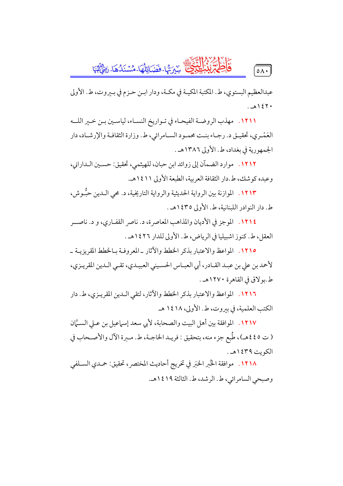 • مهذب الروضة الفيحاء في تواريخ النساء، لياسين بن خير الله العَمْري، تحقيق د. رجاء بنت محمود السامرائي، ط. وزارة الثقافة والإرشاد، دار الجمهورية في بغداد، ط. الأولى ١٣٨٦ هـ.