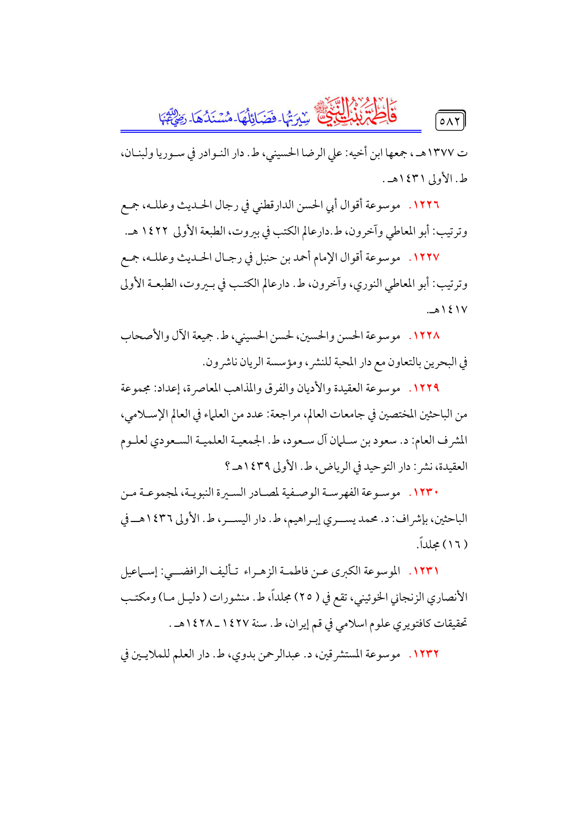 • الموسوعة الكبرى عن فاطمة الزهراء تأليف الرافضي: إسماعيل الأنصاري الزنجاني الخوئيني، تقع في (٢٥) مجلداً، ط. منشورات (دليل ما) ومكتب تحقيقات كافتويري علوم اسلامي في قم إيران، ط. سنة ١٤٢٧ ـ ١٤٢٨ هـ.
