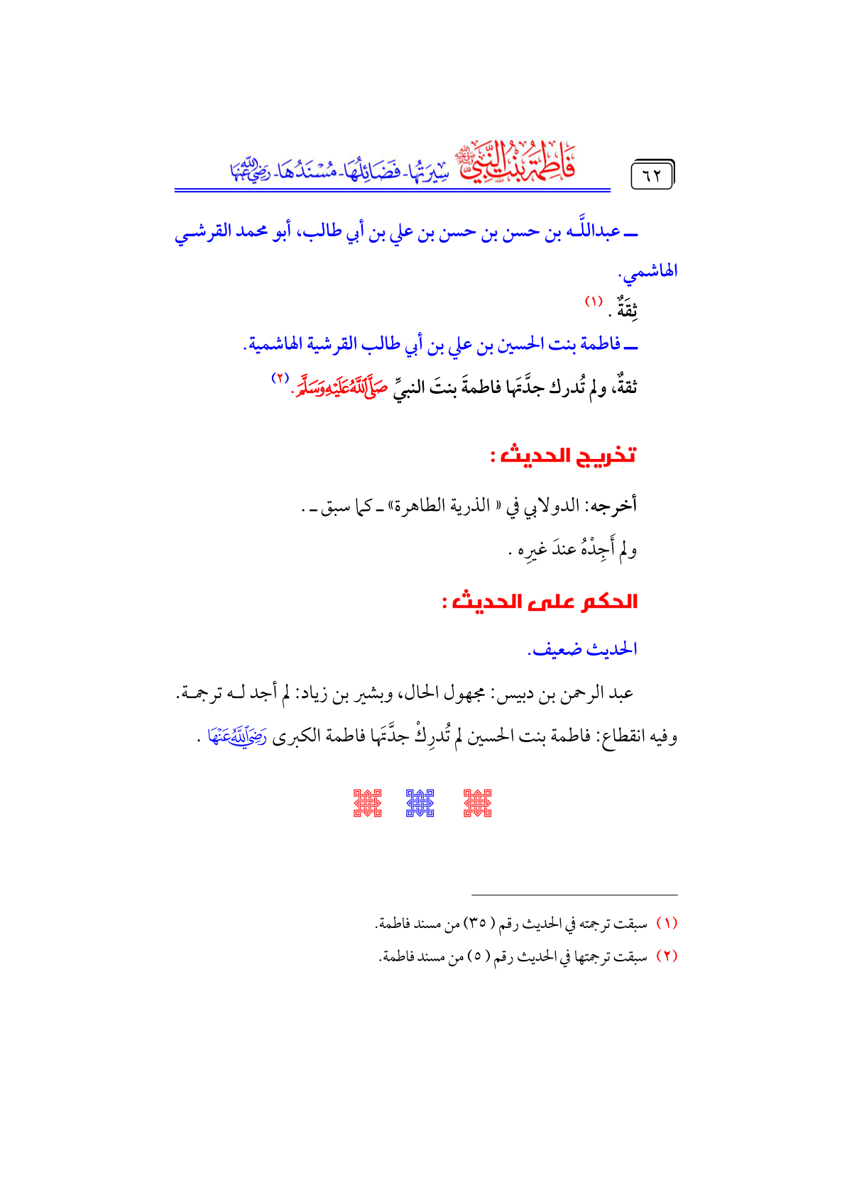 عبد الرحمن بن دبيس: مجهول الحال، وبشير بن زياد: لم أجد له ترجمة. وفيه انقطاع: فاطمة بنت الحسين لم تُدرِكْ جدَّتَها فاطمة الكبرى - رضي الله عنها -.