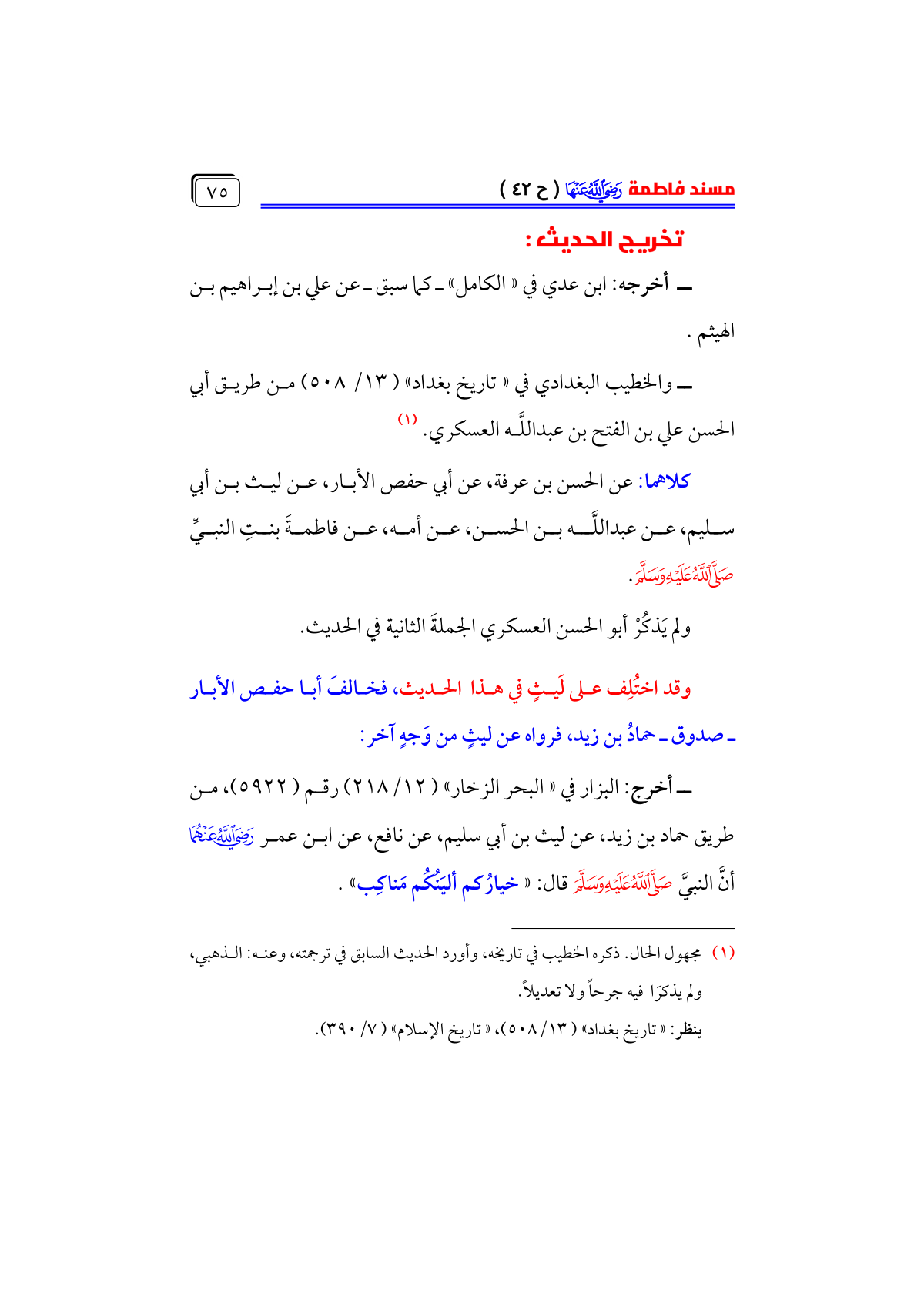 كلاهما: عن الحسن بن عرفة، عن أبي حفص الأبار، عن ليث بن أبي سليم، عن عبداللَّه بن الحسن، عن أمه، عن فاطمةَ بنتِ النبيِّ - صلى الله عليه وسلم -.