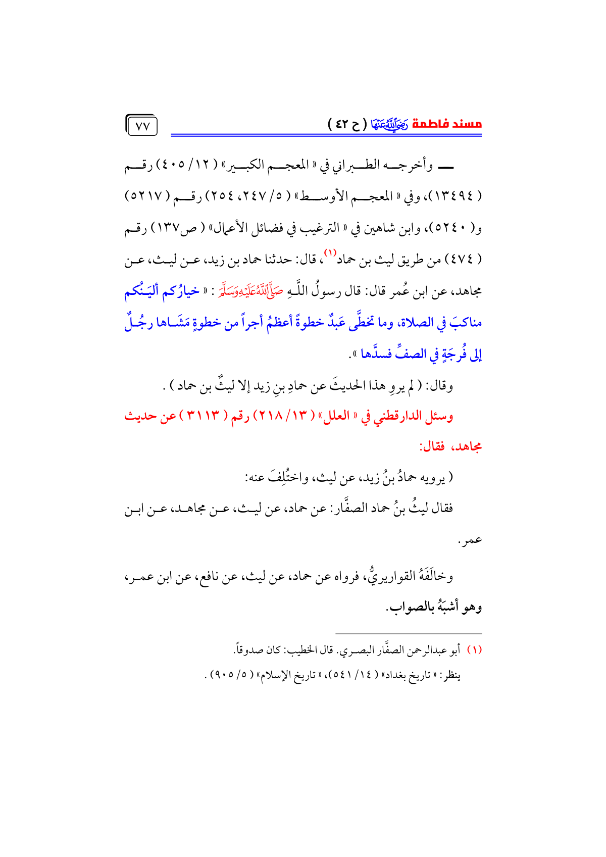 ـ وأخرجه الطبراني في «المعجم الكبير» (١٢/ ٤٠٥) رقم ... (١٣٤٩٤)، وفي «المعجم الأوسط» (٥/ ٢٤٧، ٢٥٤) رقم (٥٢١٧) ... و (٥٢٤٠)، وابن شاهين في «الترغيب في فضائل الأعمال» (ص ١٣٧) رقم (٤٧٤) من طريق ليث بن حماد (¬١)، قال: حدثنا حماد بن زيد، عن ليث، عن مجاهد، عن ابن عُمر قال: قال رسولُ اللَّهِ - صلى الله عليه وسلم -: «خيارُكم أليَنُكم مناكبَ في الصلاة، وما تخطَّى عَبدٌ خطوةً أعظمُ أجراً من خطوةٍ مَشَاها رجُلٌ إلى فُرجَةٍ في الصفِّ فسدَّها».
