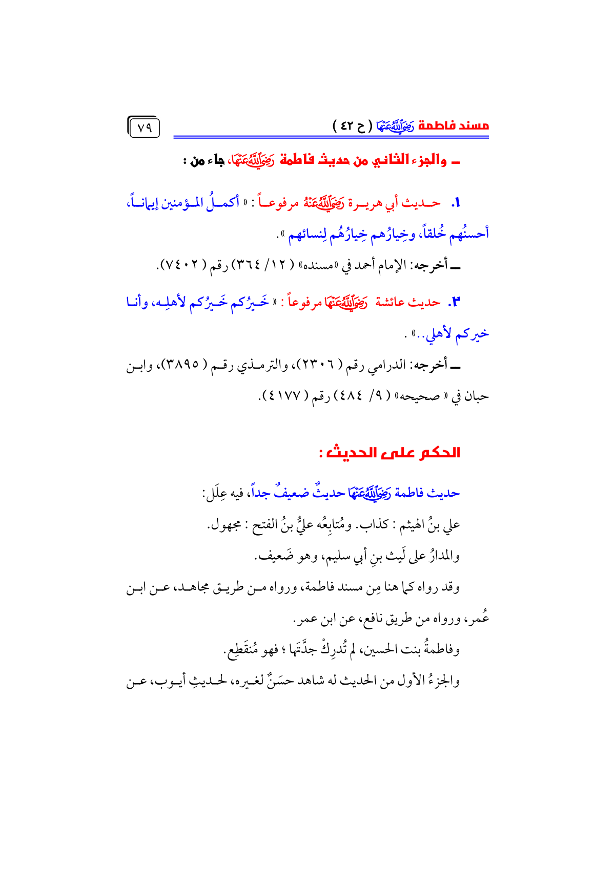 ٢. حديث عائشة - رضي الله عنها - مرفوعاً: «خَيرُكم خَيرُكم لأهلِه، وأنا خيركم لأهلي .. ».