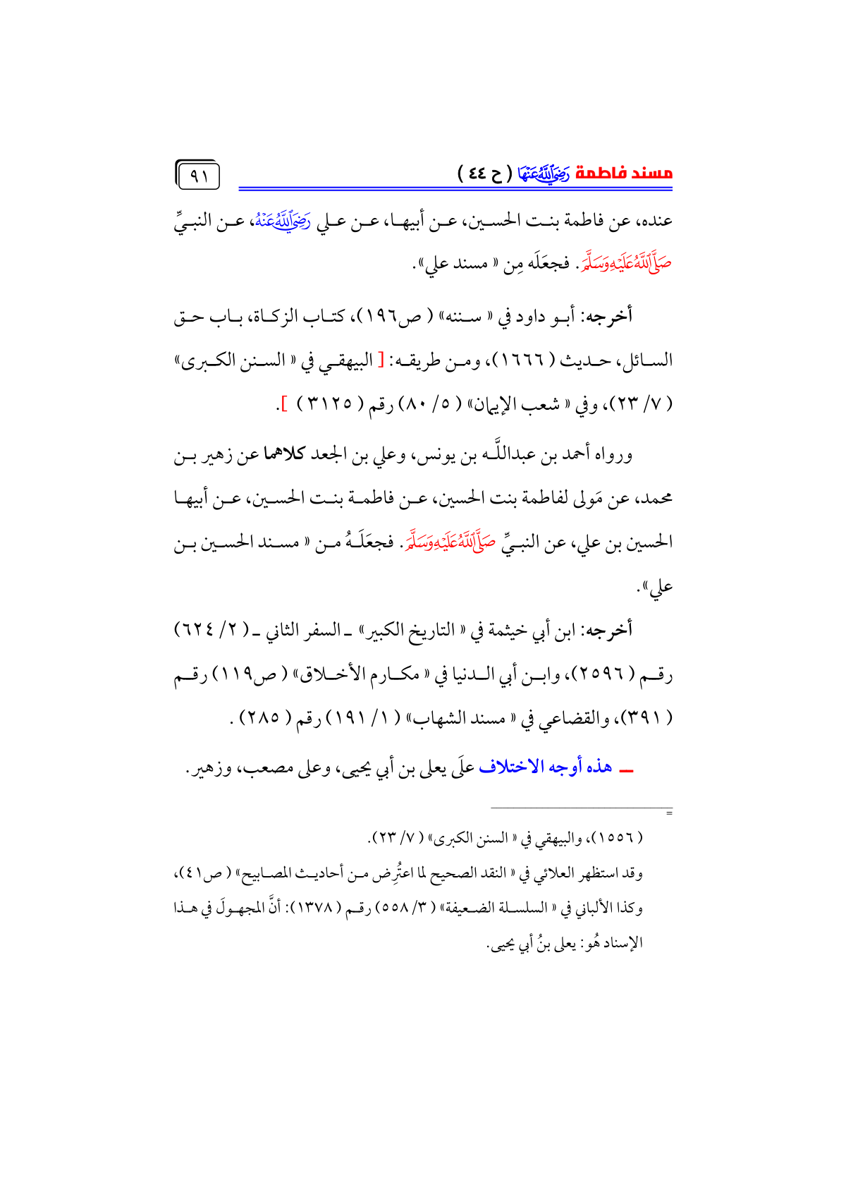 ورواه أحمد بن عبداللَّه بن يونس، وعلي بن الجعد كلاهما عن زهير بن محمد، عن مَولى لفاطمة بنت الحسين، عن فاطمة بنت الحسين، عن أبيها الحسين بن علي، عن النبيِّ - صلى الله عليه وسلم -. فجعَلَهُ من «مسند الحسين بن علي».