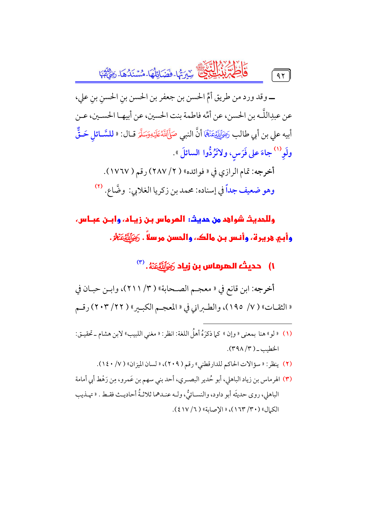 وقد ورد من طريق أمِّ الحسن بن جعفر بن الحسن بنِ الحسنِ بنِ علي، عن عبدِاللَّه بن الحسن، عن أمِّه فاطمة بنت الحسين، عن أبيها الحسين، عن أبيه علي بن أبي طالب - رضي الله عنهما - أنَّ النبي - صلى الله عليه وسلم - قال: «للسَّائلِ حَقٌّ ولَوِ (¬١) جاءَ على فَرَسٍ، ولاتَرُدُّوا السائلَ».