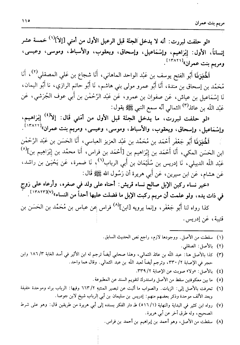 [13821] أخبرنا أبو الفتح يوسف بن عبد الواحد الماهاني أنا شجاع بن علي المصقلي (2) أنا محمد بن إسحاق بن مندة أنا أبو عمرو مولى بني هاشم نا أبو حاتم الرازي نا أبو اليمان نا إسماعيل بن عياش عن صفوان بن عمرو عن عبد الرحمن بن أبي عوف الجرشي عن عبد الله بن عائذ (3) الثمالي أنه سمع النبي (صلى الله عليه وسلم) يقول: " لو حلفت لبررت ما يدخل الجنة قبل الأول من أمتي قال: [إلا] (4) إبراهيم وإسماعيل وإسحاق ويعقوب والأسباط وموسى وعيسى ومريم بنت عمران "