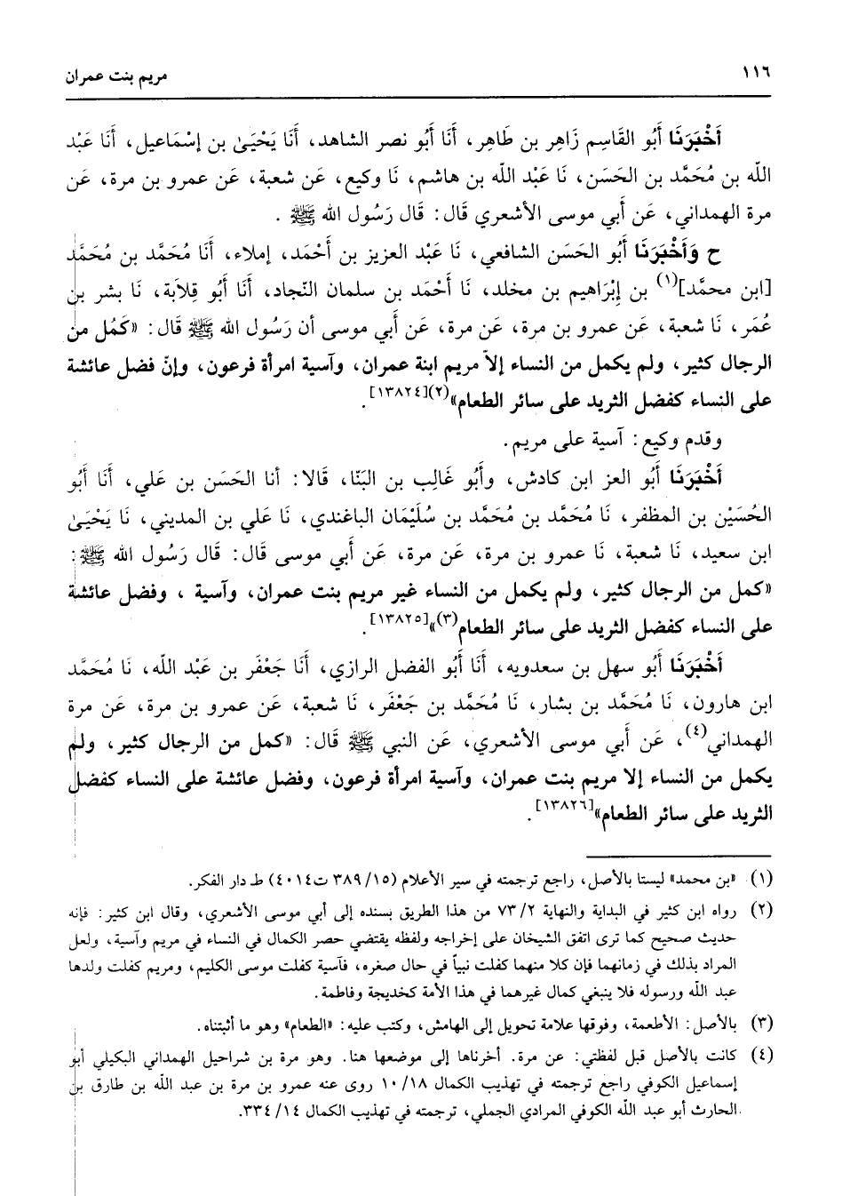 أخبرنا أبو القاسم زاهر بن طاهر أنا أبو نصر الشاهد أنا يحيى بن إسماعيل أنا عبد الله بن محمد بن الحسن نا عبد الله بن هاشم نا وكيع عن شعبة عن عمرو بن مرة عن مرة الهمداني عن أبي موسى الأشعري قال قال رسول الله (صلى الله عليه وسلم) ح وأخبرنا أبو الحسن الشافعي نا عبد العزيز بن أحمد إملاء أنا محمد بن محمد [بن محمد] (1) بن إبراهيم بن مخلد نا أحمد بن سلمان النجاد أنا أبو قلابة نا بشر بن عمر نا شعبة عن عمرو بن مرة عن مرة عن أبي موسى أن رسول الله (صلى الله عليه وسلم) قال " كمل من الرجال كثير ولم يكمل من النساء إلا مريم ابنة عمران وآسية امرأة فرعون وإن فضل عائشة على النساء كفضل الثريد على سائر الطعام (2) "