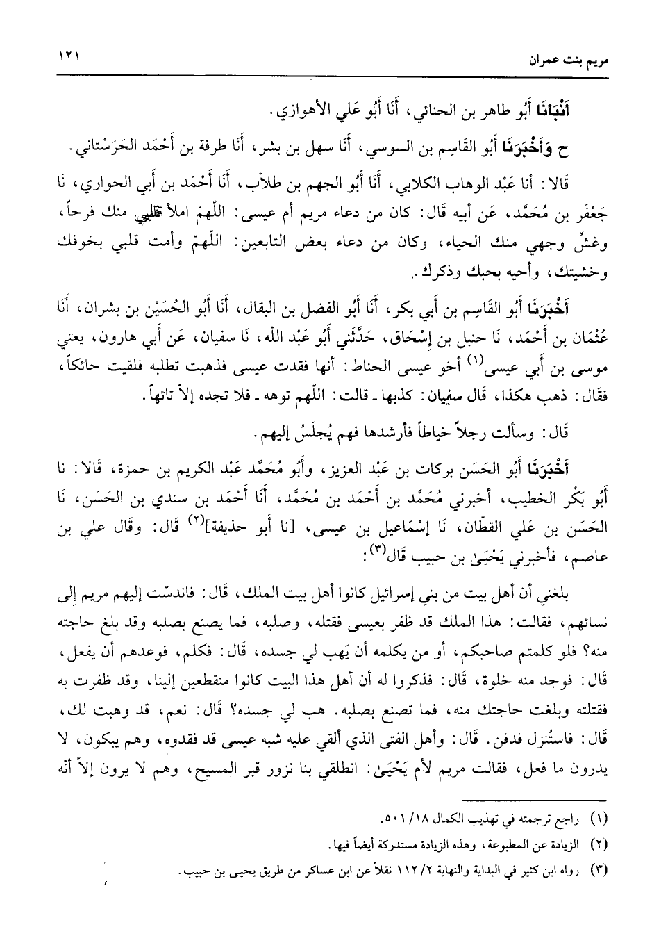 أنبأنا أبو طاهر بن الحنائي أنا أبو علي الأهوازي ح وأخبرنا أبو القاسم بن السوسي أنا سهل بن بشر أنا طرفة بن أحمد الحرستاني قالا أنا عبد الوهاب الكلابي أنا أبو الجهم بن طلاب أنا أحمد بن أبي الحواري نا جعفر بن محمد عن أبيه قال كان من دعاء مريم أم عيسى اللهم املأ قلبي منك فرحا وغش وجهي منك الحياء وكان من دعاء بعض التابعين اللهم وأمت قلبي بخوفك وخشيتك وأحيه بحبك وذكرك أخبرنا أبو القاسم بن أبي بكر أنا أبو الفضل بن البقال أنا أبو الحسين بن بشران أنا عثمان بن أحمد نا حنبل بن إسحاق حدثني أبو عبد الله نا سفيان عن أبي هارون يعني موسى بن أبي عيسى (1) أخو عيسى الحناط أنها فقدت عيسى فذهبت تطلبه فلقيت حائكا فقال ذهب هكذا قال سفيان كذبها قالت اللهم توهه فلا تجده إلا تائها قال وسألت رجلا خياطا فأرشدها فهم يجلس إليهم أخبرنا أبو الحسن بركات بن عبد العزيز وأبو محمد عبد الكريم بن حمزة قالا نا أبو بكر الخطيب أخبرني محمد بن أحمد بن محمد أنا أحمد بن سندي بن الحسن نا الحسن بن علي القطان نا إسماعيل بن عيسى [نا أبو حذيفة] (2) قال وقال علي بن عاصم فأخبرني يحيى بن حبيب قال (3) بلغني أن أهل بيت من بني إسرائيل كانوا أهل بيت الملك قال فاندست إليهم مريم إلى نسائهم فقالت هذا الملك قد ظفر بعيسى فقتله وصلبه فما يصنع بصلبه وقد بلغ حاجته منه؟ فلو كلمتم صاحبكم أو من يكلمه أن يهب لي جسده قال فكلم فوعدهم أن يفعل قال فوجد منه خلوة قال فذكروا له أن أهل هذا البيت كانوا منقطعين إلينا وقد ظفرت به فقتلته وبلغت حاجتك منه فما تصنع بصلبه هب لي جسده قال نعم قد وهبت لك قال فاستنزل فدفن قال وأهل الفتى الذي القي عليه شبه عيسى قد فقدوه وهم يبكون لا يدرون ما فعل فقالت مريم لأم يحيى انطلقي بنا نزور قبر المسيح وهم لا يرون إلا أنه