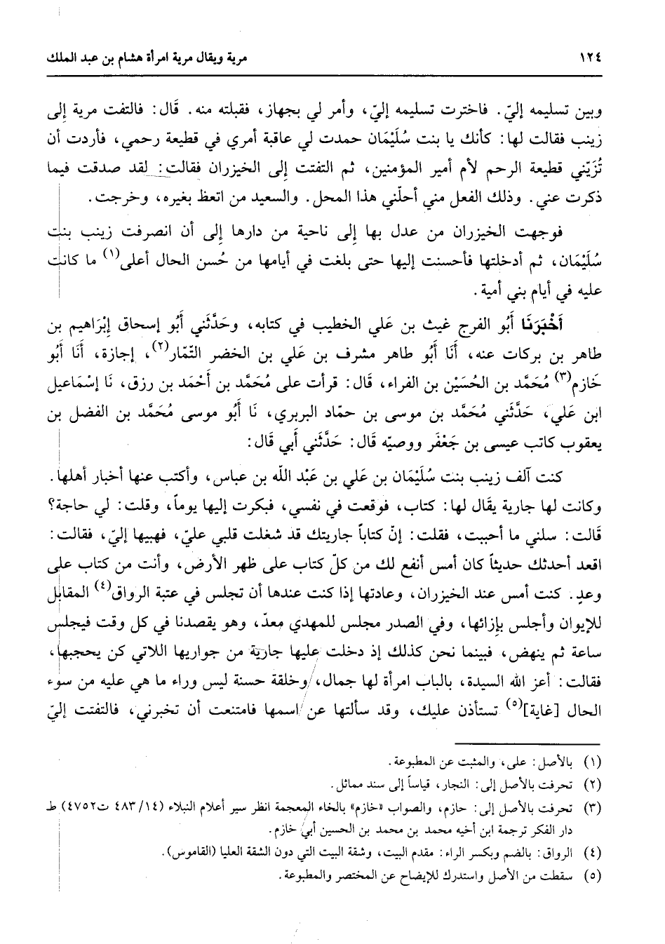 وبين تسليمه إلي فاخترت تسليمه إلي وأمر لي بجهاز فقبلته منه قال فالتفت مرية إلى زينب فقالت لها كأنك يا بنت سليمان حمدت لي عاقبة أمري في قطيعة رحمي فأردت أن تزيني قطيعة الرحم لأم أمير المؤمنين ثم التفتت إلى الخيزران فقالت لقد صدقت فيما ذكرت عني وذلك الفعل مني أحلني هذا المحل والسعيد من اتعظ بغيره وخرجت فوجهت الخيزران من عدل بها إلى ناحية من دارها إلى أن انصرفت زينب بنت سليمان ثم أدخلتها فأحسنت إليها حتى بلغت في أيامها من حسن الحال أعلى (1) ما كانت عليه في أيام بني أمية أخبرنا أبو الفرج غيث بن علي الخطيب في كتابه وحدثني أبو إسحاق إبراهيم بن طاهر بن بركات عنه أنا أبو طاهر مشرف بن علي بن الخضر التمار (2) إجازة أنا أبو خازم (3) محمد بن الحسين بن الفراء قال قرأت على محمد بن أحمد بن رزق نا إسماعيل ابن علي حدثني محمد بن موسى بن حماد البربري نا أبو موسى محمد بن الفضل بن يعقوب كاتب عيسى بن جعفر ووصيه قال حدثني أبي قال كنت آلف زينب بنت سليمان بن علي بن عبد الله بن عباس وأكتب عنها أخبار أهلها وكانت لها جارية يقال لها كتاب فوقعت في نفسي فبكرت إليها يوما وقلت لي حاجة قالت سلني ما أحببت فقلت إن كتابا جاريتك قد شغلت قلبي علي فهبيها إلي فقالت اقعد أحدثك حديثا كان أمس أنفع لك من كل كتاب على ظهر الأرض وأنت من كتاب على وعد كنت أمس عند الخيزران وعادتها إذا كنت عندها أن تجلس في عتبة الرواق (4) المقابل للإيوان وأجلس بإزائها وفي الصدر مجلس للمهدي معد وهو يقصدنا في كل وقت فيجلس ساعة ثم ينهض فبينما نحن كذلك إذ دخلت عليها جارية من جواريها اللاتي كن يحجبها فقالت أعز الله السيدة بالباب امرأة لها جمال وخلقة حسنة ليس وراء ما هي عليه من سوء الحال [غاية] (5) تستأذن عليك وقد سألتها عن اسمها فامتنعت أن تخبرني فالتفتت إلي