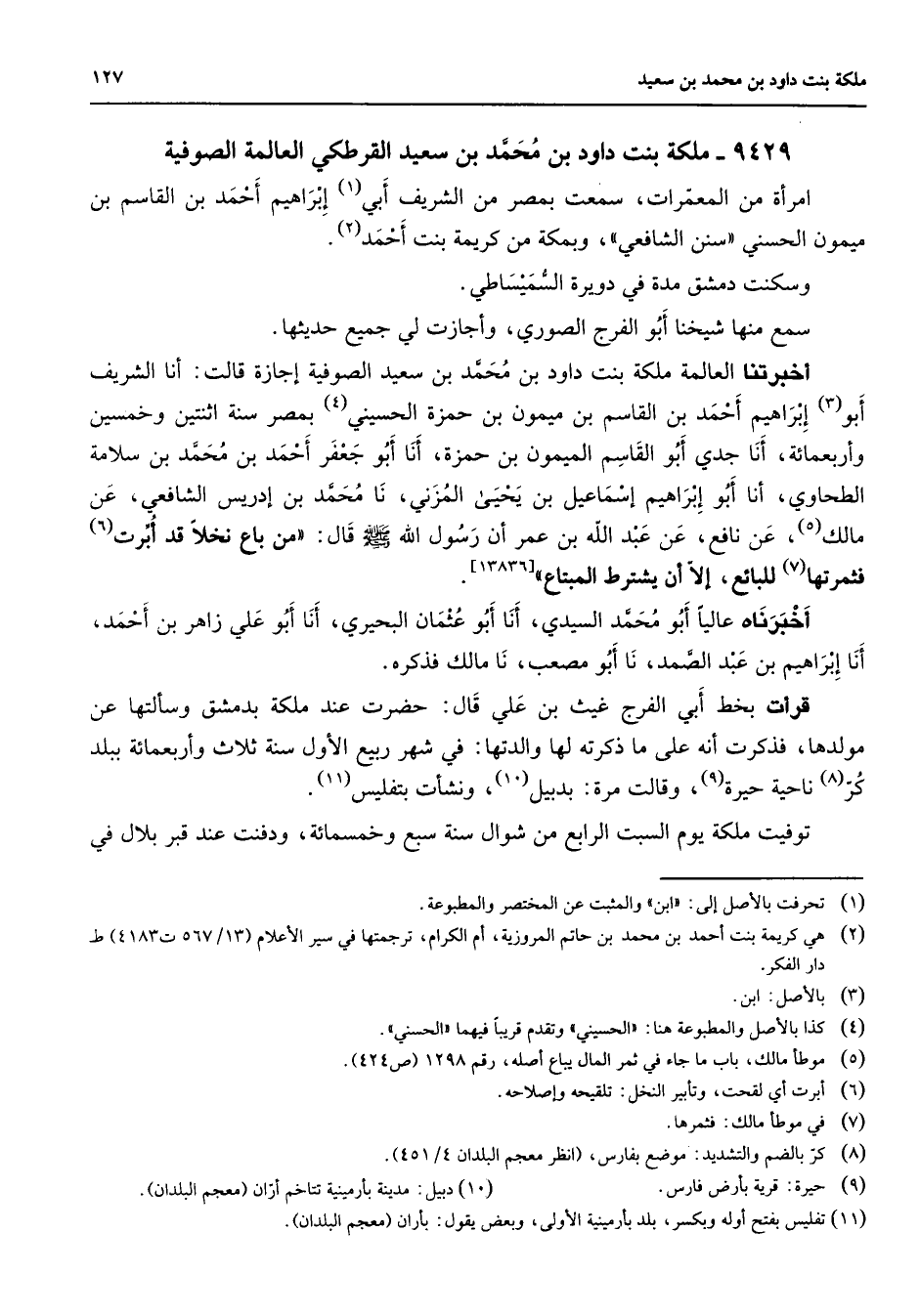 9429 - ملكة بنت داود بن محمد بن سعيد القرطكي العالمة الصوفية امرأة من المعمرات سمعت بمصر من الشريف أبي (1) إبراهيم أحمد بن القاسم بن ميمون الحسني سنن الشافعي وبمكة من كريمة بنت أحمد (2) وسكنت دمشق مدة في دويرة السميساطي سمع منها شيخنا أبو الفرج الصوري وأجازت لي جميع حديثها أخبرتنا العالمة ملكة بنت داود بن محمد بن سعيد الصوفية إجازة قالت أنا الشريف أبو (3) إبراهيم أحمد بن القاسم بن ميمون بن حمزة الحسيني (4) بمصر سنة اثنتين وخمسين وأربعمائة أنا جدي أبو القاسم الميمون بن حمزة أنا أبو جعفر أحمد بن محمد بن سلامة الطحاوي أنا أبو إبراهيم إسماعيل بن يحيى المزني نا محمد بن إدريس الشافعي عن مالك (5) عن نافع عن عبد الله بن عمر أن رسول الله (صلى الله عليه وسلم) قال " من باع نخلا قد أبرت (6) فثمرتها (7) للبائع إلا أن يشترط المبتاع "