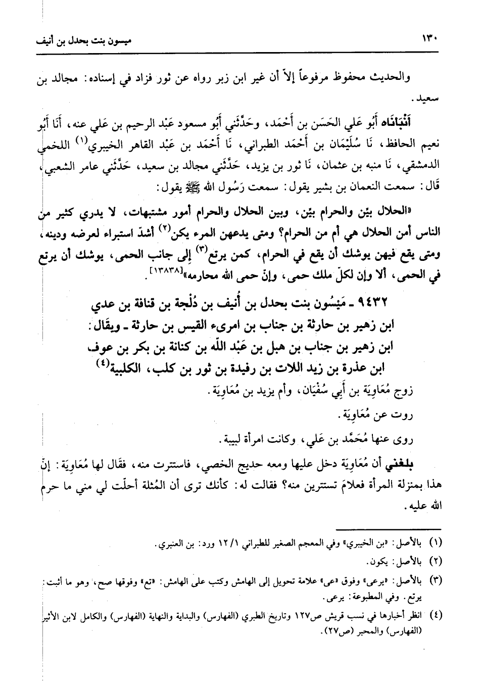 والحديث محفوظ مرفوعا إلا أن ح ح غير ابن زبر رواه عن ثور فزاد في إسناده مجالد بن سعيد أنبأناه أبو علي الحسن بن أحمد وحدثني أبو مسعود عبد الرحيم بن علي عنه أنا أبو نعيم الحافظ نا سليمان بن أحمد الطبراني نا أحمد بن عبد القاهر الخيبري (1) اللخمي الدمشقي نا منبه بن عثمان نا ثور بن يزيد حدثني مجالد بن سعيد حدثني عامر الشعبي قال سمعت النعمان بن بشير يقول سمعت رسول الله (صلى الله عليه وسلم) يقول: " الحلال بين والحرام بين وبين الحلال والحرام أمور مشتبهات لا يدري كثير من الناس أمن الحلال هي أم من الحرام ومتى يدعهن المرء يكن (2) أشد استبراء لعرضه ودينه ومتى يقع فيهن يوشك أن يقع في الحرام كمن يرتع (3) إلى جانب الحمى يوشك أن يرتع
