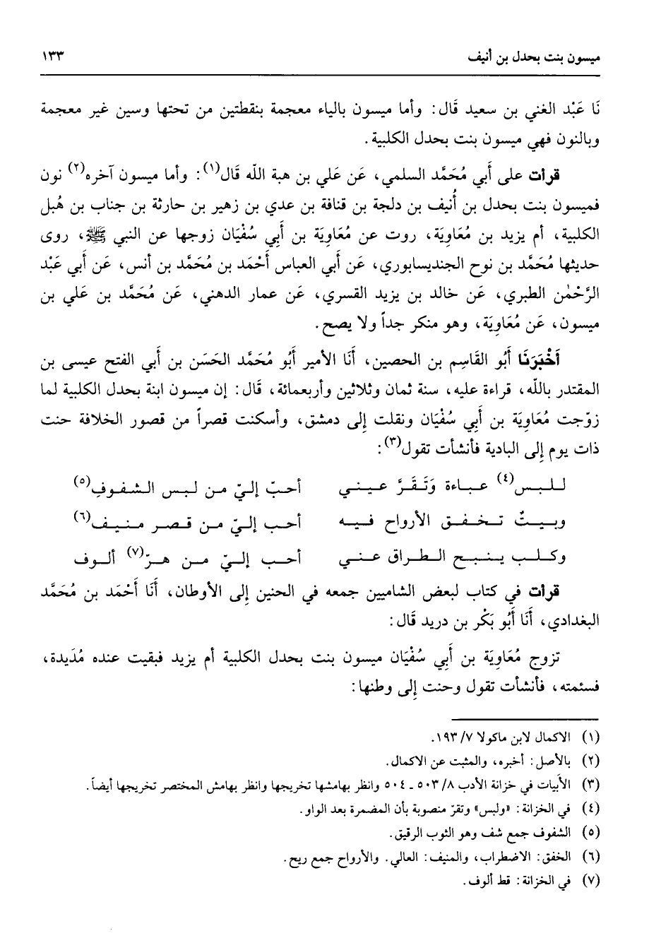 نا عبد الغني بن سعيد قال وأما ميسون بالياء معجمة بنقطتين من تحتها وسين غير معجمة وبالنون فهي ميسون بنت بحدل الكلبية قرأت على أبي محمد السلمي عن علي بن هبة الله قال (1) وأما ميسون آخره (2) نون فميسون بنت بحدل بن أنيف بن دلجة بن قنافة بن عدي بن زهير بن حارثة بن جناب بن هبل الكلبية أم يزيد بن معاوية روت عن معاوية بن أبي سفيان زوجها عن النبي (صلى الله عليه وسلم) روى حديثها محمد بن نوح الجنديسابوري عن أبي العباس أحمد بن محمد بن أنس عن أبي عبد الرحمن الطبري عن خالد بن يزيد القسري عن عمار الدهني عن محمد بن علي بن ميسون عن معاوية وهو منكر جدا ولا يصح أخبرنا أبو القاسم بن الحصين أنا الأمير أبو محمد الحسن بن أبي الفتح عيسى بن المقتدر بالله قراءة عليه سنة ثمان وثلاثين وأربعمائة قال إن ميسون ابنة بحدل الكلبية لما زوجت معاوية بن أبي سفيان ونقلت إلى دمشق وأسكنت قصرا من قصور الخلافة حنت ذات يوم إلى البادية فأنشأت تقول (3) : للبس (4) عباءة وتقر عيني * أحب إلي من لبس الشفوف (5) وبيت تخفق الأرواح فيه * أحب إلي من قصر منيف (6) وكلب ينبح الطراق عني * أحب إلي من هر (7) ألوف