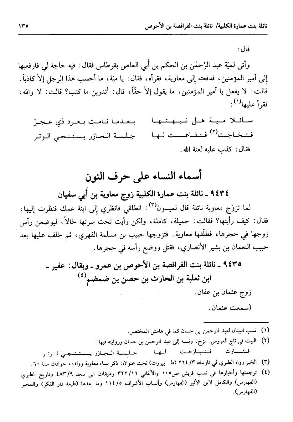 9434 - نائلة بنت عمارة الكلبية زوج معاوية بن أبي سفيان لما تزوج معاوية نائلة قال لميسون (3) : انطلقي فانظري إلى ابنة عمك فنظرت إليها فقال كيف رأيتها؟ فقالت جميلة كاملة ولكن رأيت تحت سرتها خالا ليوضعن رأس زوجها في حجرها فطلقها معاوية فتزوجها حبيب بن مسلمة الفهري ثم خلف عليها بعد حبيب النعمان بن بشير الأنصاري فقتل ووضع رأسه في حجرها