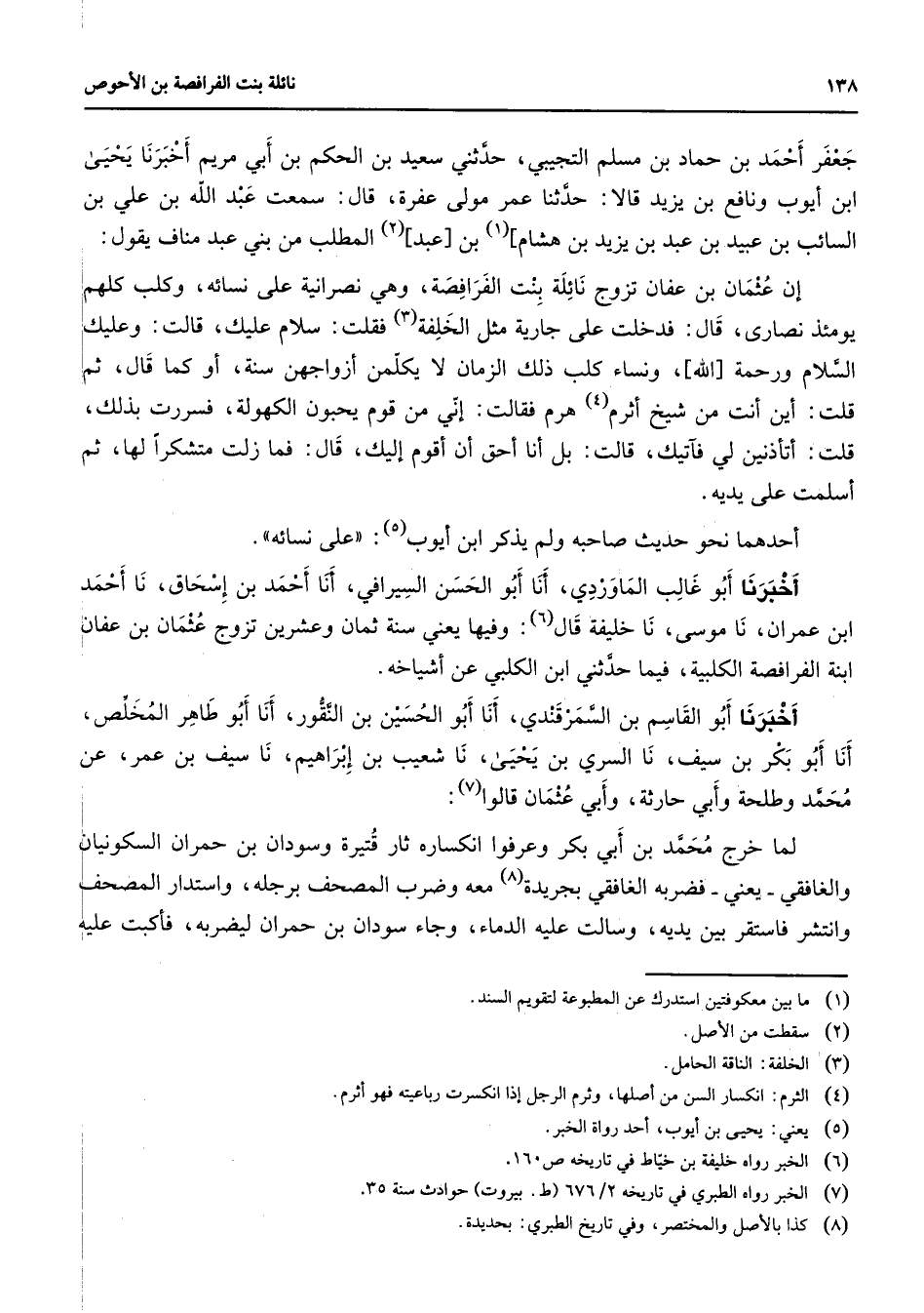 جعفر أحمد بن حماد بن مسلم التجيبي حدثني سعيد بن الحكم بن أبي مريم أخبرنا يحيى بن أيوب ونافع بن يزيد قالا حدثنا عمر مولى عفرة قال سمعت عبد الله بن علي بن السائب بن عبيد بن عبد بن يزيد بن هشام] (1) بن [عبد] (2) المطلب من بني عبد مناف يقول: إن عثمان بن عفان تزوج نائلة بنت الفرافصة وهي نصرانية على نسائه وكلب كلهم يومئذ نصارى قال فدخلت على جارية مثل الخلفة (3) فقلت سلام عليك قالت وعليك السلام ورحمة [الله] ونساء كلب ذلك الزمان لا يكلمن أزواجهن سنة أو كما قال ثم قلت أين أنت من شيخ أثرم (4) هرم فقالت إني من قوم يحبون الكهولة فسررت بذلك قلت أتأذنين لي فأتيك قالت بل أنا أحق أن أقوم إليك قال فما زلت متشكرا لها ثم أسلمت على يديه أحدهما نحو حديث صاحبه ولم يذكر ابن أيوب (5) " على نسائه " أخبرنا أبو غالب الماوردي أنا أبو الحسن السيرافي أنا أحمد بن إسحاق نا أحمد ابن عمران نا موسى نا خليفة قال (6) وفيها يعني سنة ثمان وعشرين تزوج عثمان بن عفان ابنة الفرافصة الكلبية فيما حدثني ابن الكلبي عن أشياخه أخبرنا أبو القاسم بن السمرقندي أنا أبو الحسين بن النقور أنا أبو طاهر المخلص أنا أبو بكر بن سيف نا السري بن يحيى نا شعيب بن إبراهيم نا سيف بن عمر عن محمد وطلحة وأبي حارثة وأبي عثمان قالوا (7) لما خرج محمد بن أبي بكر وعرفوا انكساره ثار قتيرة وسودان بن حمران السكونيان والغافقي يعني فضربه الغافقي بجريدة (8) معه وضرب المصحف برجله واستدار المصحف وانتشر فاستقر بين يديه وسالت عليه الدماء وجاء سودان بن حمران ليضربه فأكبت عليه