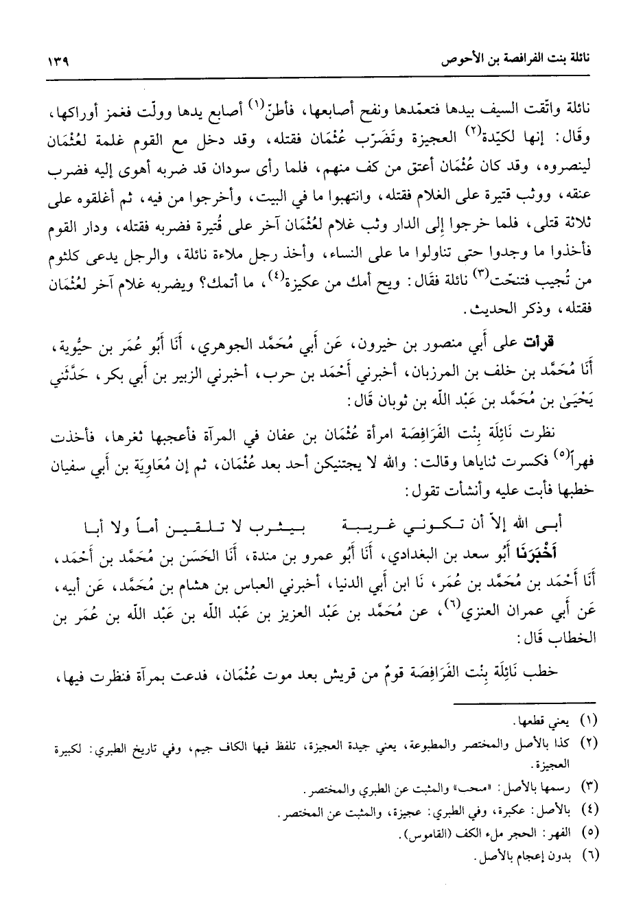 أخبرنا أبو سعد بن البغدادي أنا أبو عمرو بن مندة أنا الحسن بن محمد بن أحمد أنا أحمد بن محمد بن عمر نا ابن أبي الدنيا أخبرني العباس بن هشام بن محمد عن أبيه عن أبي عمران العنزي (6) عن محمد بن عبد العزيز بن عبد الله بن عبد الله بن عمر بن الخطاب قال: خطب نائلة بنت الفرافصة قوم من قريش بعد موت عثمان فدعت بمرآة فنظرت فيها
