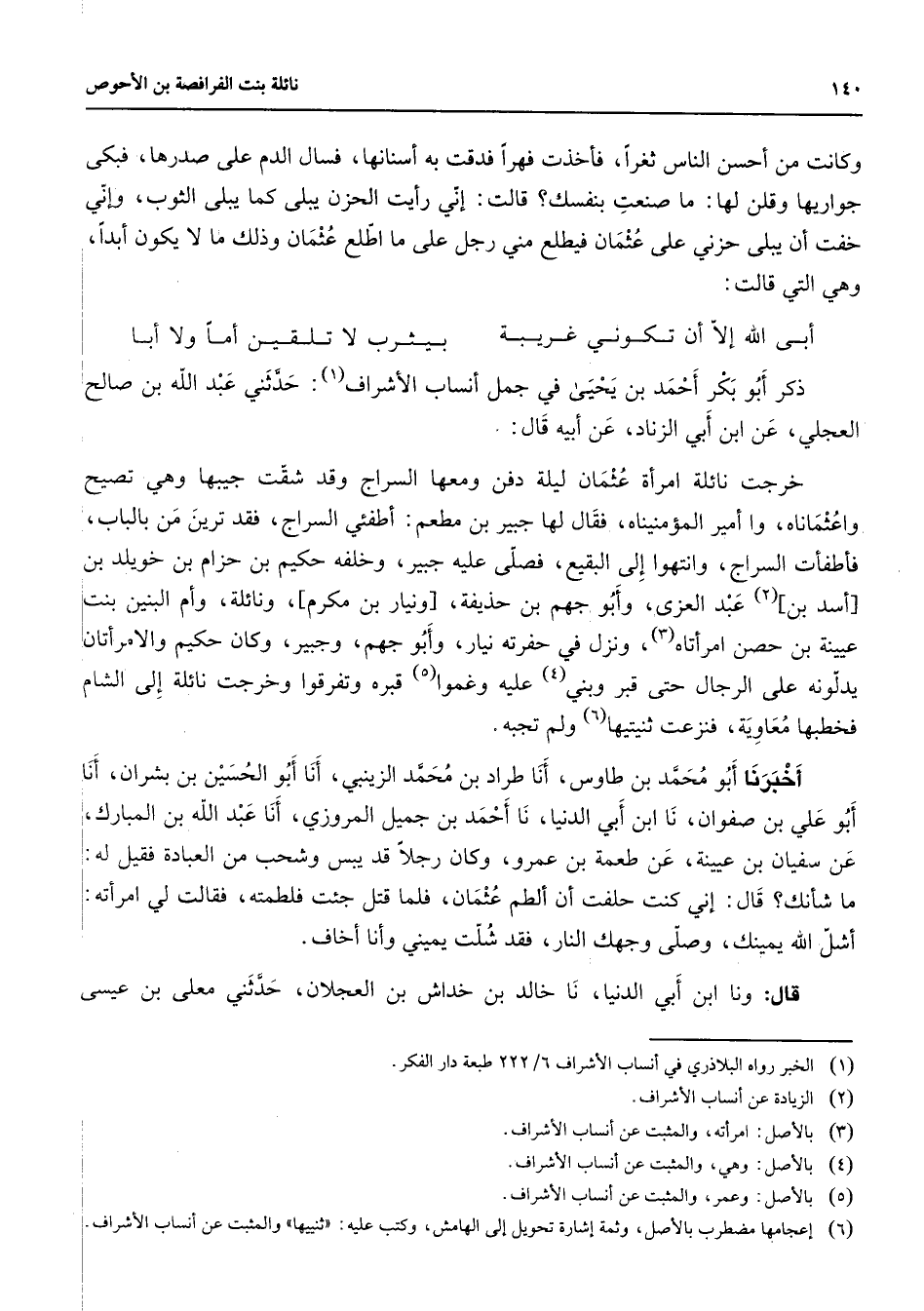 ذكر أبو بكر أحمد بن يحيى في جمل أنساب الأشراف (1) حدثني عبد الله بن صالح العجلي عن ابن أبي الزناد عن أبيه قال: خرجت نائلة امرأة عثمان ليلة دفن ومعها السراج وقد شقت جيبها وهي تصيح واعثماناه وأمير المؤمنيناه فقال لها جبير بن مطعم أطفئي السراج فقد ترين من بالباب فأطفأت السراج وانتهوا إلى البقيع فصلى عليه جبير وخلفه حكيم بن حزام بن خويلد بن [أسد بن] (2) عبد العزى وأبو جهم بن حذيفة ونيار بن مكرم ونائلة وأم البنين بنت عيينة بن حصن امرأتاه (3) ونزل في حفرته نيار وأبو جهم وجبير وكان حكيم والامرأتان يدلونه على الرجال حتى قبر وبني (4) عليه وغموا (5) قبره وتفرقوا وخرجت نائلة إلى الشام فخطبها معاوية فنزعت ثنيتيها (6) ولم تجبه أخبرنا أبو محمد بن طاوس أنا طراد بن محمد الزينبي أنا أبو الحسين بن بشران أنا أبو علي بن صفوان نا ابن أبي الدنيا نا أحمد بن جميل المروزي أنا عبد الله بن المبارك عن سفيان بن عيينة عن طعمة بن عمرو وكان رجلا قد يبس وشحب من العبادة فقيل له ما شأنك قال إني كنت حلفت أن ألطم عثمان فلما قتل جئت فلطمته فقالت لي امرأته أشل الله يمينك وصلى وجهك النار فقد شلت يميني وأنا أخاف قال ونا ابن أبي الدنيا نا خالد بن خداش بن العجلان حدثني معلى بن عيسى