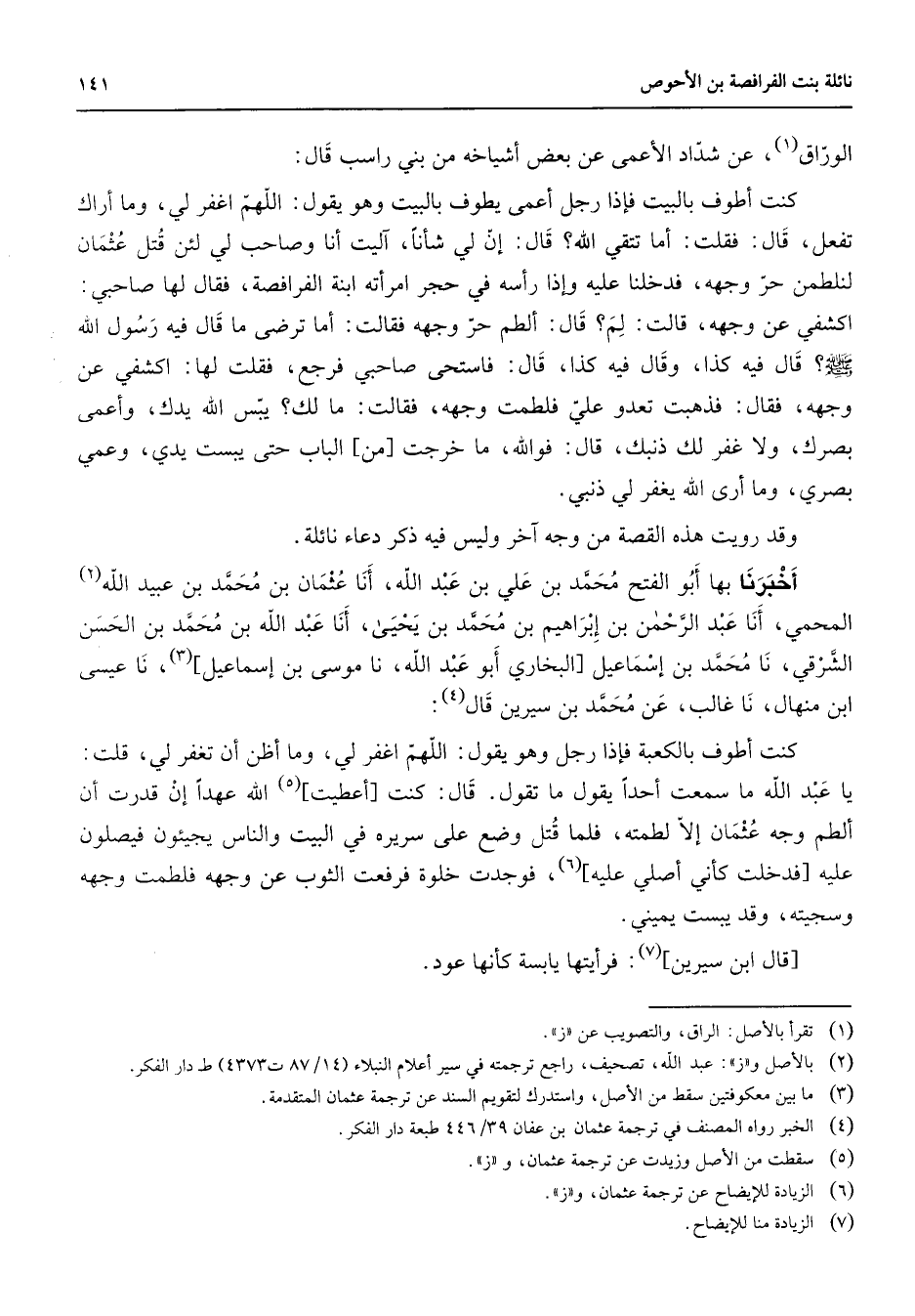 الوراق (1) عن شداد الأعمى عن بعض أشياخه من بني راسب قال كنت أطوف بالبيت فإذا رجل أعمى يطوف بالبيت وهو يقول اللهم اغفر لي وما أراك تفعل قال فقلت أما تتقي الله قال إن لي شأنا آليت أنا وصاحب لي لئن قتل عثمان لنلطمن حر وجهه فدخلنا عليه وإذا رأسه في حجر امرأته ابنة الفرافصة فقال لها صاحبي اكشفي عن وجهه قالت لم قال ألطم حر وجهه فقالت أما ترضى ما قال فيه رسول الله (صلى الله عليه وسلم) قال فيه كذا وقال فيه كذا قال فاستحى صاحبي فرجع فقلت لها اكشفي عن وجهه فقال فذهبت تعدو علي فلطمت وجهه فقالت ما لك يبس الله يدك وأعمى بصرك ولا غفر لك ذنبك قال فوالله ما خرجت من الباب حتى يبست يدي وعمي بصري وما أرى الله يغفر لي ذنبي وقد رويت هذه القصة من وجه آخر وليس فيه ذكر دعاء نائلة أخبرنا بها أبو الفتح محمد بن علي بن عبد الله أنا عثمان بن محمد بن عبيد الله (2) المحمي أنا عبد الرحمن بن إبراهيم بن محمد بن يحيى أنا عبد الله بن محمد بن الحسن الشرقي نا محمد بن إسماعيل [البخاري أبو عبد الله نا موسى بن إسماعيل] (3) نا عيسى ابن منهال نا غالب عن محمد بن سيرين قال (4) : كنت أطوف بالكعبة فإذا رجل وهو يقول اللهم اغفر لي وما أظن أن تغفر لي قلت يا عبد الله ما سمعت أحدا يقول ما تقول قال كنت [أعطيت] (5) الله عهدا إن قدرت أن ألطم وجه عثمان إلا لطمته فلما قتل وضع على سريره في البيت والناس يجيئون فيصلون عليه [فدخلت كأني أصلي عليه] (6) فوجدت خلوة فرفعت الثوب عن وجهه فلطمت وجهه وسجيته وقد يبست يميني [قال ابن سيرين] (7) فرأيتها يابسة كأنها عود