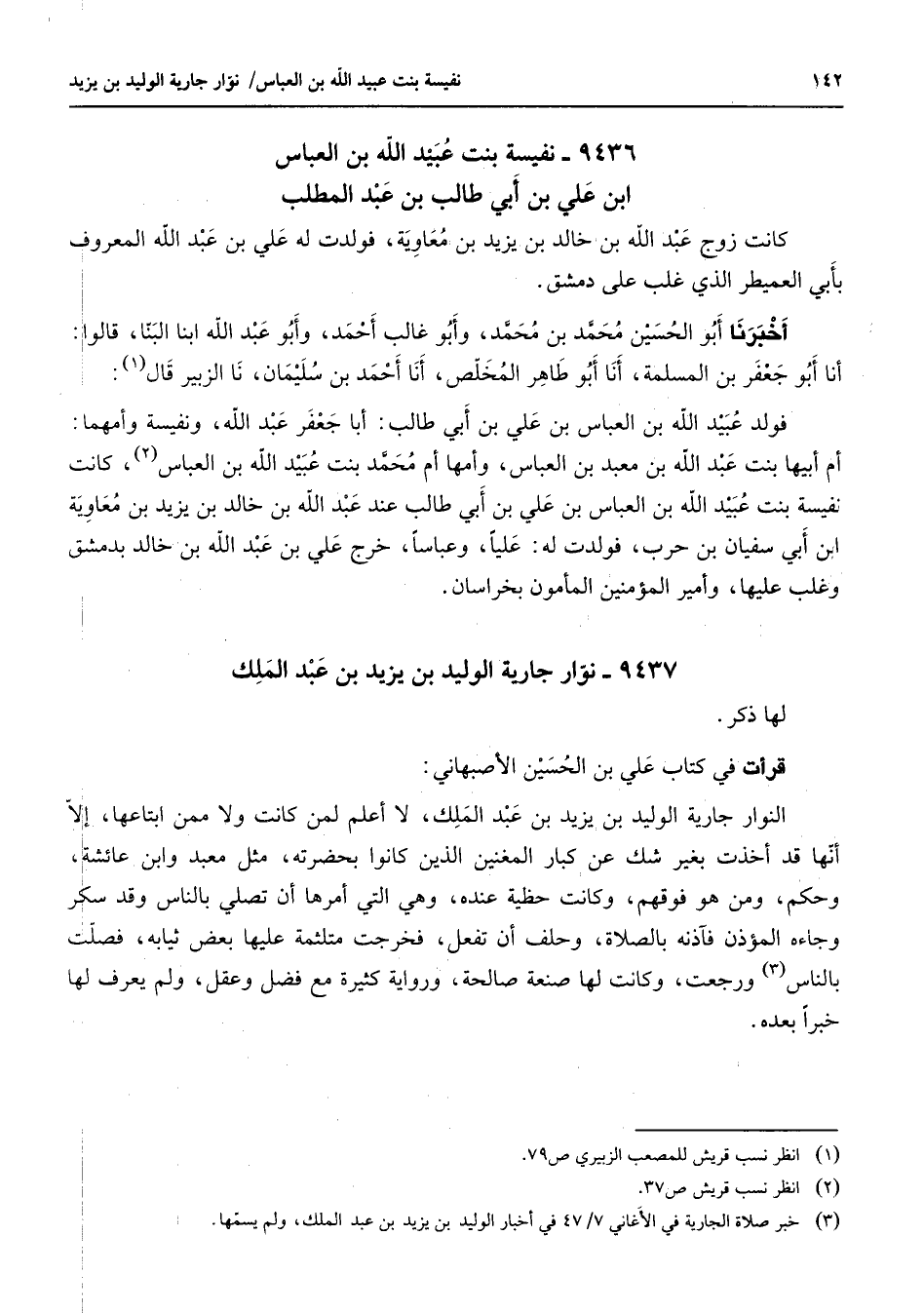 9436 - نفيسة بنت عبيد الله بن العباس ابن علي بن أبي طالب بن عبد المطلب كانت زوج عبد الله بن خالد بن يزيد بن معاوية فولدت له علي بن عبد الله المعروف بأبي العميطر الذي غلب على دمشق أخبرنا أبو الحسين محمد بن محمد وأبو غالب أحمد وأبو عبد الله ابنا البنا قالوا أنا أبو جعفر بن المسلمة أنا أبو طاهر المخلص أنا أحمد بن سليمان نا الزبير قال (1) : فولد عبيد الله بن العباس بن علي بن أبي طالب أبا جعفر عبد الله ونفيسة وأمهما أم أبيها بنت عبد الله بن معبد بن العباس وأمها أم محمد بنت عبيد الله بن العباس (2) كانت نفيسة بنت عبيد الله بن العباس بن علي بن أبي طالب عند عبد الله بن خالد بن يزيد بن معاوية ابن أبي سفيان بن حرب فولدت له عليا وعباسا خرج علي بن عبد الله بن خالد بدمشق وغلب عليها وأمير المؤمنين المأمون بخراسان