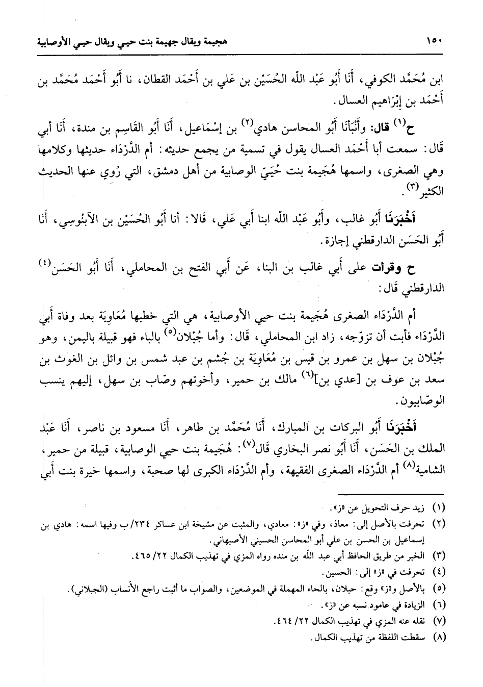 ابن محمد الكوفي أنا أبو عبد الله الحسين بن علي بن أحمد القطان نا أبو أحمد محمد بن أحمد بن إبراهيم العسال ح (1) قال وأنبأنا أبو المحاسن هادي (2) بن إسماعيل أنا أبو القاسم بن مندة أنا أبي قال سمعت أبا أحمد العسال يقول في تسمية من يجمع حديثه أم الدرداء حديثها وكلامها وهي الصغرى واسمها هجيمة بنت حيي الوصابية من أهل دمشق التي روي عنها الحديث الكثير (3) أخبرنا أبو غالب وأبو عبد الله ابنا أبي علي قالا أنا أبو الحسين بن الآبنوسي أنا أبو الحسن الدارقطني إجازة ح وقرأت على أبي غالب بن البنا عن أبي الفتح بن المحاملي أنا أبو الحسن (4) الدارقطني قال: أم الدرداء الصغرى هجيمة بنت حيي الأوصابية هي التي خطبها معاوية بعد وفاة أبي الدرداء فأبت أن تزوجه زاد ابن المحاملي قال وأما جبلان (5) بالباء فهو قبيلة باليمن وهو جبلان بن سهل بن عمرو بن قيس بن معاوية بن جشم بن عبد شمس بن وائل بن الغوث بن سعد بن عوف بن [عدي بن] (6) مالك بن حمير وأخوتهم وصاب بن سهل إليهم ينسب الوصابيون أخبرنا أبو البركات بن المبارك أنا محمد بن طاهر أنا مسعود بن ناصر أنا عبد الملك بن الحسن أنا أبو نصر البخاري قال (7) هجيمة بنت حيي الوصابية قبيلة من حمير الشامية (8) أم الدرداء الصغرى الفقيهة وأم الدرداء الكبرى لها صحبة واسمها خيرة بنت أبي