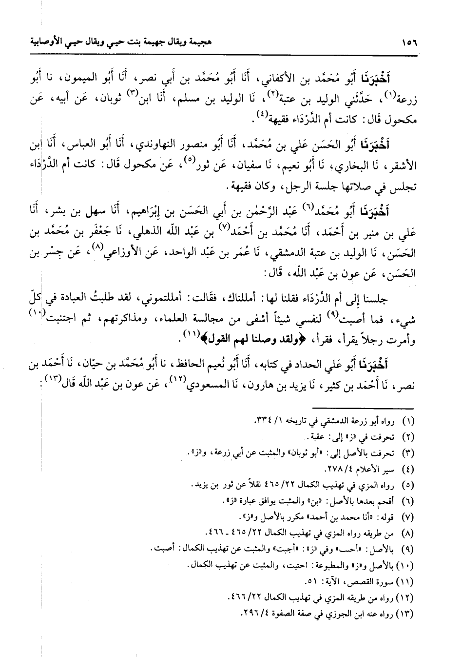 أخبرنا أبو محمد بن الأكفاني أنا أبو محمد بن أبي نصر أنا أبو الميمون نا أبو زرعة (1) حدثني الوليد بن عتبة (2) نا الوليد بن مسلم أنا ابن (3) ثوبان عن أبيه عن مكحول قال كانت أم الدرداء فقيهة (4) أخبرنا أبو الحسن علي بن محمد أنا أبو منصور النهاوندي أنا أبو العباس أنا ابن الأشقر نا البخاري نا أبو نعيم نا سفيان عن ثور (5) عن مكحول قال كانت أم الدرداء تجلس في صلاتها جلسة الرجل وكانت فقيهة أخبرنا أبو محمد (6) عبد الرحمن بن أبي الحسن بن إبراهيم أنا سهل بن بشر أنا علي بن منير بن أحمد أنا محمد بن أحمد (7) بن عبد الله الذهلي نا جعفر بن محمد بن الحسن نا الوليد بن عتبة الدمشقي نا عمر بن عبد الواحد عن الأوزاعي (8) عن جسر بن الحسن عن عون بن عبد الله قال: جلسنا إلى أم الدرداء فقلنا لها أمللناك فقالت أمللتموني لقد طلبت العبادة في كل شئ فما أصبت (9) لنفسي شيئا أشفى من مجالسة العلماء ومذاكرتهم ثم اجتنبت (10) وأمرت رجلا يقرأ فقرأ " ولقد وصلنا لهم القول " (11) أخبرنا أبو علي الحداد في كتابه أنا أبو نعيم الحافظ نا أبو محمد بن حيان نا أحمد بن نصر نا أحمد بن كثير نا يزيد بن هارون نا المسعودي (12) عن عون بن عبد الله قال (13) :