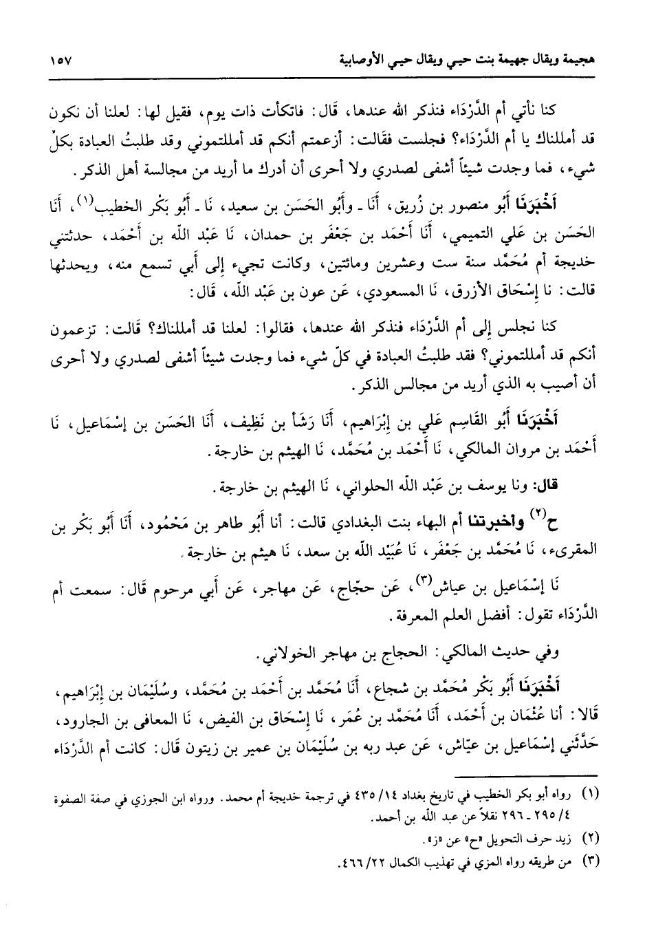 كنا نأتي أم الدرداء فنذكر الله عندها قال فاتكأت ذات يوم فقيل لها لعلنا أن نكون قد أمللناك يا أم الدرداء فجلست فقالت أزعمتم أنكم قد أمللتموني وقد طلبت العبادة بكل شئ فما وجدت شيئا أشفى لصدري ولا أحرى أن أدرك ما أريد من مجالسة أهل الذكر أخبرنا أبو منصور بن زريق أنا وأبو الحسن بن سعيد نا أبو بكر الخطيب (1) أنا الحسن بن علي التميمي أنا أحمد بن جعفر بن حمدان نا عبد الله بن أحمد حدثتني خديجة أم محمد سنة ست وعشرين ومائتين وكانت تجئ إلى أبي تسمع منه ويحدثها قالت نا إسحاق الأزرق نا المسعودي عن عون بن عبد الله قال كنا نجلس إلى أم الدرداء فنذكر الله عندها فقالوا لعلنا قد أمللناك قالت تزعمون أنكم قد أمللتموني فقد طلبت العبادة في كل شئ فما وجدت شيئا أشفى لصدري ولا أحرى أن أصيب به الذي أريد من مجالس الذكر أخبرنا أبو القاسم علي بن إبراهيم أنا رشأ بن نظيف أنا الحسن بن إسماعيل نا أحمد بن مروان المالكي نا أحمد بن محمد نا الهيثم بن خارجة قال ونا يوسف بن عبد الله الحلواني نا الهيثم بن خارجة ح (2) وأخبرتنا أم البهاء بنت البغدادي قالت أنا أبو طاهر بن محمود أنا أبو بكر بن المقرئ نا محمد بن جعفر نا عبيد الله بن سعد نا هيثم بن خارجة نا إسماعيل بن عياش (3) عن حجاج عن مهاجر عن أبي مرحوم قال سمعت أم الدرداء تقول أفضل العلم المعرفة وفي حديث المالكي الحجاج بن مهاجر الخولاني أخبرنا أبو بكر محمد بن شجاع أنا محمد بن أحمد بن محمد وسليمان بن إبراهيم قالا أنا عثمان بن أحمد أنا محمد بن عمر نا إسحاق بن الفيض نا المعافى بن الجارود حدثني إسماعيل بن عياش عن عبد ربه بن سليمان بن عمير بن زيتون قال كانت أم الدرداء