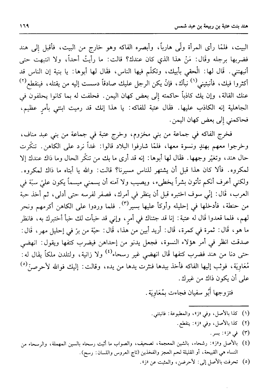 البيت فلما رأى المرأة ولى هاربا وأبصره الفاكه وهو خارج من البيت فأقبل إلى هند فضربها برجله وقال من هذا الذي كان عندك قالت ما رأيت أحدا ولا انتبهت حتى انبهتني قال لها الحقي بأبيك وتكلم فيها الناس فقال لها أبوها يا بنية إن الناس قد أكثروا فيك فانبئيني (1) نبأك فإن يكن الرجل عليك صادقا دسست إليه من يقتله فينقطع (2) عنك القالة وإن يك كاذبا حاكمته إلى بعض كهان اليمن فحلفت له بما كانوا يحلفون في الجاهلية إنه الكاذب عليها فقال عتبة للفاكه يا هذا إنك قد رميت ابنتي بأمر عظيم فحاكمني إلى بعض كهان اليمن فخرج الفاكه في جماعة من بني مخزوم وخرج عتبة في جماعة من بني عبد مناف وخرجوا معهم بهند ونسوة معها فلما شارفوا البلاد قالوا غدا نرد على الكاهن تنكرت حال هند وتغير وجهها فقال لها أبوها إنه قد أرى ما بك من تنكر الحال وما ذاك عندك إلا لمكروه فألا كان هذا قبل أن يشتهر للناس مسيرنا قالت والله يا أبتاه ما ذاك لمكروه ولكني أعرف أنكم تأتون بشرا يخطئ ويصيب ولا آمنه أن يسمني ميسما يكون علي سبة في العرب قال إني سوف أختبره قبل أن ينظر في أمرك فصفر لفرسه حتى أدلى ثم أخذ حبة من حنطة فأدخلها في إحليله وأوكأ عليها بسير (3) فلما وردوا على الكاهن أكرمهم ونحر لهم فلما قعدوا قال له عتبة إنا قد جئناك في أمر وإني قد خبأت لك خبأ أختبرك به فانظر ما هو قال ثمرة في كمرة قال أريد أبين من هذا قال حبة من بر في أحليل مهر قال صدقت انظر في أمر هؤلاء النسوة فجعل يدنو من إحداهن فيضرب كتفها ويقول انهضي حتى دنا من هند فضرب كتفها قال انهضي غير رسحاء (4) ولا زانية ولتلدن ملكا يقال له معاوية فوثب إليها الفاكه فأخذ بيدها فنثرت يدها من يده وقالت إليك فوالله لأحرصن (5) على أن يكون ذاك من غيرك فتزوجها أبو سفيان فجاءت بمعاوية