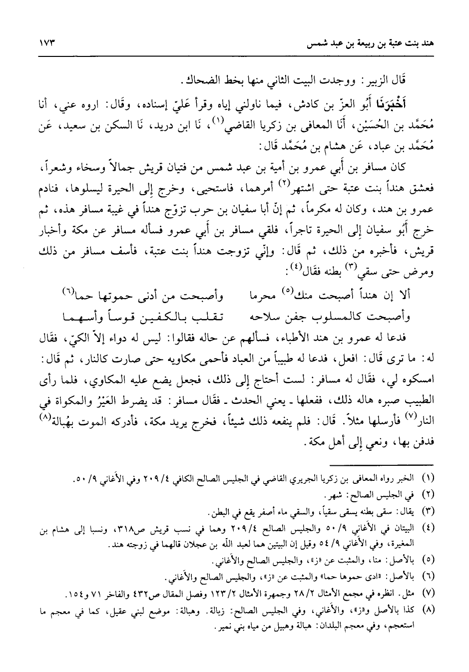 قال الزبير ووجدت البيت الثاني منها بخط الضحاك أخبرنا أبو العز بن كادش فيما ناولني إياه وقرأ علي إسناده وقال اروه عني أنا محمد بن الحسين أنا المعافى بن زكريا القاضي (1) نا ابن دريد نا السكن بن سعيد عن محمد بن عباد عن هشام بن محمد قال: كان مسافر بن أبي عمرو بن أمية بن عبد شمس من فتيان قريش جمالا وسخاء وشعرا فعشق هندا بنت عتبة حتى اشتهر (2) أمرهما فاستحيى وخرج إلى الحيرة ليسلوها فنادم عمرو بن هند وكان له مكرما ثم إنا أبا سفيان بن حرب تزوج هندا في غيبة مسافر هذه ثم خرج أبو سفيان إلى الحيرة تاجرا فلقي مسافرا بن أبي عمرو فسأله مسافر عن مكة وأخبار قريش فأخبره من ذلك ثم قال وإني تزوجت هندا بنت عتبة فأسف مسافر من ذلك ومرض حتى سقي (3) بطنه فقال (4) : ألا إن هندا أصبحت منك (5) محرما * وأصبحت من أدنى حموتها حما (6) وأصبحت كالمسلوب جفن سلاحه * تقلب بالكفين قوسا وأسهما