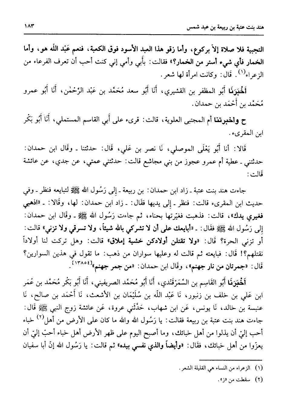 التجبية فلا صلاة إلا بركوع وأما زقو هذا العبد الأسود فوق الكعبة فنعم عبد الله هو وأما الخمار فأي شئ أستر من الخمار فقالت بأبي وأمي إني كنت أحب أن تعرف الفرعاء من الزعراء (1) قال وكانت امرأة لها شعر أخبرنا أبو المظفر بن القشيري أنا أبو سعد محمد بن عبد الرحمن أنا أبو عمرو محمد بن أحمد بن حمدان ح وأخبرتنا أم المجتبى العلوية قالت قرئ على أبي القاسم المستملي أنا أبو بكر بن المقرئ قالا أنا أبو يعلى الموصلي نا نصر بن علي قال حدثتنا وقال ابن حمدان حدثتني عطية أم عمرو عجوز من بني مجاشع قالت حدثتني عمتي عن جدي عن عائشة قالت: جاءت هند بنت عتبة زاد ابن حمدان بن ربيعة إلى رسول الله (صلى الله عليه وسلم) لتبايعه فنظر وفي حديث ابن المقرئ قالت فنظر إلى يديها فقال زاد ابن حمدان لها وقالا " اذهبي فغيري يدك " قالت فذهبت فغيرتها بحناء ثم جاءت رسول الله (صلى الله عليه وسلم) وقال ابن حمدان إلى رسول الله (صلى الله عليه وسلم) فقال " أبايعك على أن لا تشركي بالله شيئا ولا تسرقي ولا تزني " قالت: أو تزني الحرة؟ قال " ولا تقتلن أولادكن خشية إملاق " قالت وهل تركت لنا أولادا نقتلهم؟ قال فبايعته ثم قالت له وعليها سواران من ذهب ما تقول في هذين السوارين؟ قال " جمرتان من نار جهنم " وقال ابن حمدان " من جمر جهنم "
