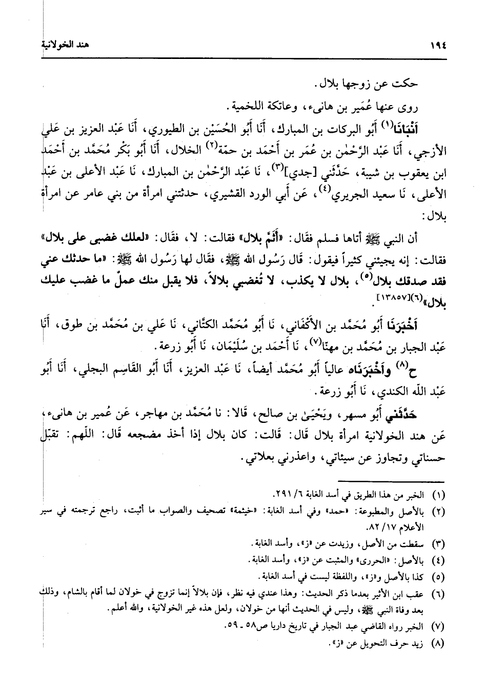 (6) عقب ابن الاثير بعدما ذكر الحديث: وهذا عندي فيه نظر فإن بلالا إنما تزوج في خولان لما أقام بالشام وذلك بعد وفاة النبي صلى الله عليه وآله وسلم وليس في الحديث أنها من خولان وولعل هذه غير الخولانية والله أعلم