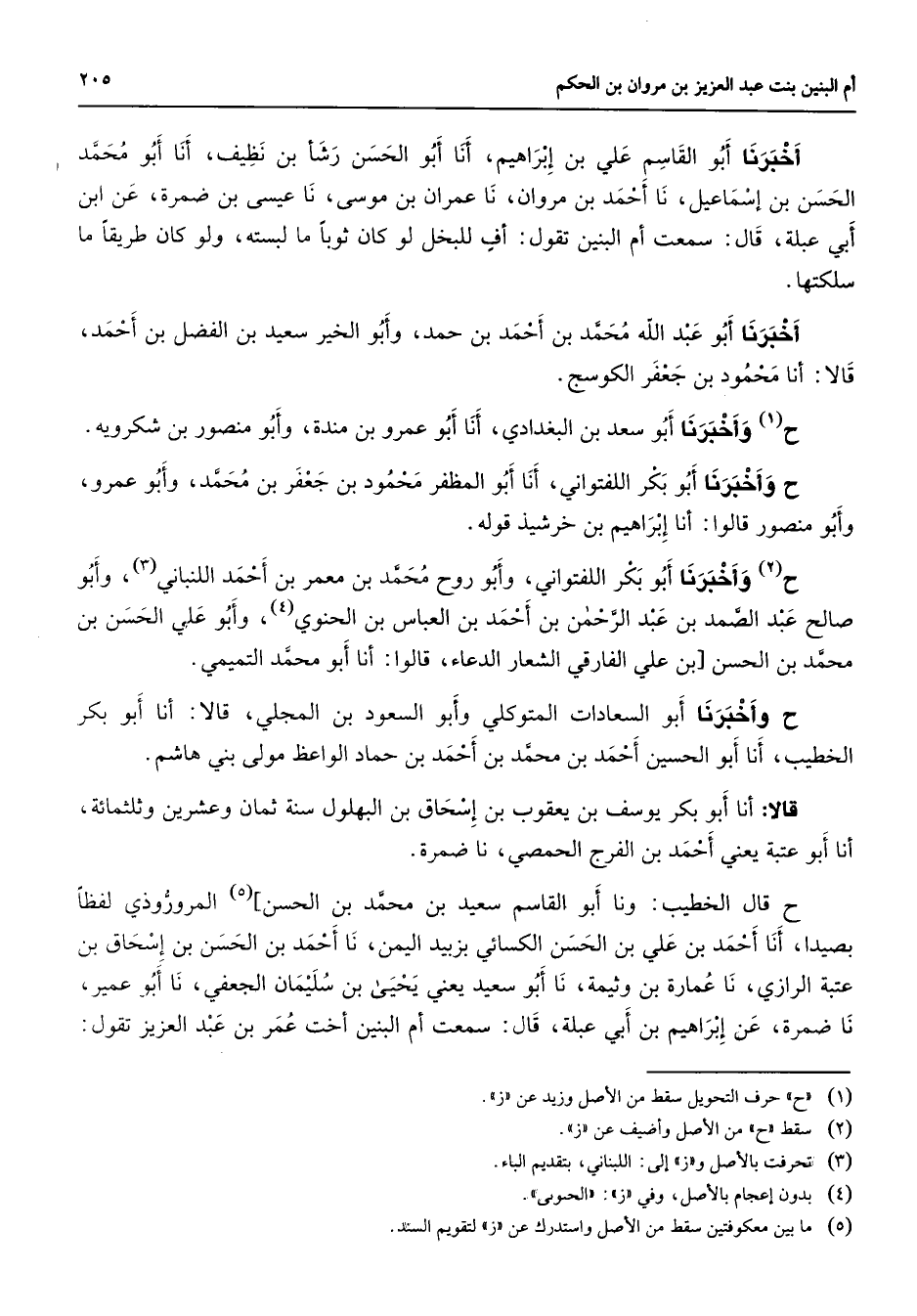 أخبرنا أبو القاسم علي بن إبراهيم أنا أبو الحسن رشأ بن نظيف أنا أبو محمد الحسن بن إسماعيل نا أحمد بن مروان نا عمران بن موسى نا عيسى بن ضمرة عن ابن أبي عبلة قال سمعت أم البنين تقول أف للبخل لو كان ثوبا ما لبسته ولو كان طريقا ما سلكتها أخبرنا أبو عبد الله محمد بن أحمد بن حمد وأبو الخير سعيد بن الفضل بن أحمد قالا أنا محمود بن جعفر الكوسج ح (1) وأخبرنا أبو سعد بن البغدادي أنا أبو عمرو بن مندة وأبو منصور بن شكرويه ح وأخبرنا أبو بكر اللفتواني أنا أبو المظفر محمود بن جعفر بن محمد وأبو عمرو وأبو منصور قالوا أنا إبراهيم بن خرشيذ قوله ح (2) وأخبرنا أبو بكر اللفتواني وأبو روح محمد بن معمر بن أحمد اللنباني (3) وأبو صالح عبد الصمد بن عبد الرحمن بن أحمد بن العباس بن الحنوي (4) وأبو علي الحسن بن محمد بن الحسن بن علي الفارقي الشعار الدعاء قالوا أنا أبو محمد التميمي ح وأخبرنا أبو السعادات المتوكلي وأبو السعود بن المجلي قالا أنا أبو بكر الخطيب أنا أبو الحسين أحمد بن محمد بن أحمد بن حماد الواعظ مولى بني هاشم قالا أنا أبو بكر يوسف بن يعقوب بن إسحاق بن البهلول سنة ثمان وعشرين وثلثمائة أنا أبو عتبة يعني أحمد بن الفرج الحمصي نا ضمرة ح قال الخطيب ونا أبو القاسم سعيد بن محمد بن الحسن] (5) المروروذي لفظا بصيدا أنا احمد بن علي بن الحسن الكسائي بزبيد اليمن نا أحمد بن الحسن بن إسحاق بن عتبة الرازي نا عمارة بن وثيمة نا أبو سعيد يعني يحيى بن سليمان الجعفي نا أبو عمير نا ضمرة عن إبراهيم بن أبي عبلة قال سمعت أم البنين أخت عمر بن عبد العزيز تقول