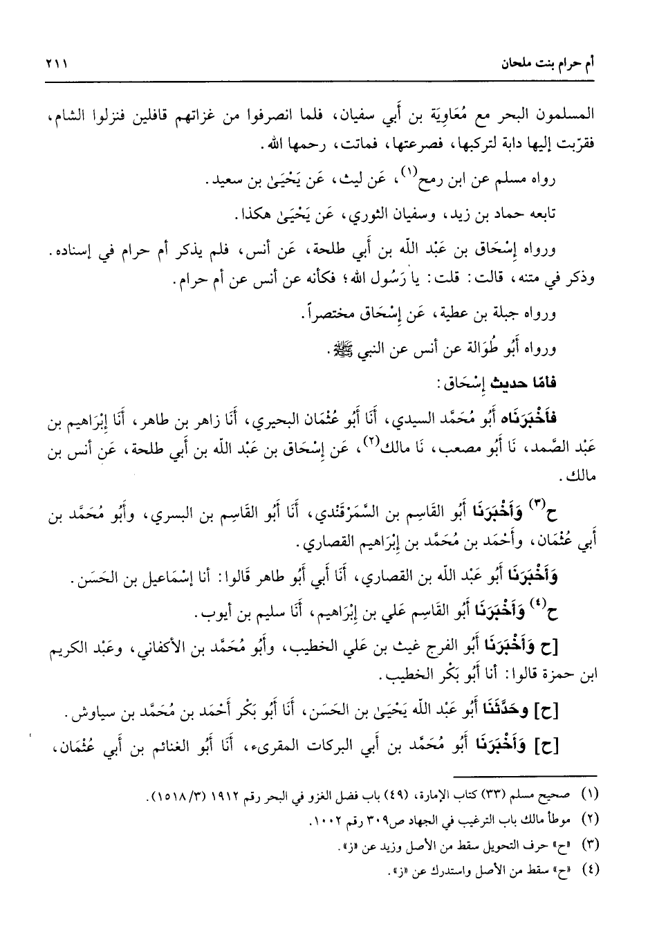 المسلمون البحر مع معاوية بن أبي سفيان فلما انصرفوا من غزاتهم قافلين فنزلوا الشام فقربت إليها دابة لتركبها فصرعتها فماتت رحمها الله رواه مسلم عن ابن رمح (1) عن ليث عن يحيى بن سعيد تابعه حماد بن زيد وسفيان الثوري عن يحيى هكذا ورواه إسحاق بن عبد الله بن أبي طلحة عن أنس فلم يذكر أم حرام في إسناده وذكر في متنه قالت قلت يا رسول الله فكأنه عن أنس عن أم حرام ورواه جبلة بن عطية عن إسحاق مختصرا ورواه أبو طوالة عن أنس عن النبي (صلى الله عليه وسلم) فأما حديث إسحاق فأخبرناه أبو محمد السيدي أنا أبو عثمان البحيري أنا زاهر بن طاهر أنا إبراهيم بن عبد الصمد نا أبو مصعب نا مالك (2) عن إسحاق بن عبد الله بن أبي طلحة عن أنس بن مالك ح (3) وأخبرنا أبو القاسم بن السمرقندي أنا أبو القاسم بن البسري وأبو محمد بن أبي عثمان وأحمد بن محمد بن إبراهيم القصاري وأخبرنا أبو عبد الله بن القصاري أنا أبي أبو طاهر قالوا أنا إسماعيل بن الحسن ح (4) وأخبرنا أبو القاسم علي بن إبراهيم أنا سليم بن أيوب [ح وأخبرنا أبو الفرج غيث بن علي الخطيب وأبو محمد بن الأكفاني وعبد الكريم ابن حمزة قالوا أنا أبو بكر الخطيب [ح] وحدثنا أبو عبد الله يحيى بن الحسن أنا أبو بكر أحمد بن محمد بن سياوش [ح] وأخبرنا أبو محمد بن أبي البركات المقرئ أنا أبو الغنائم بن أبي عثمان