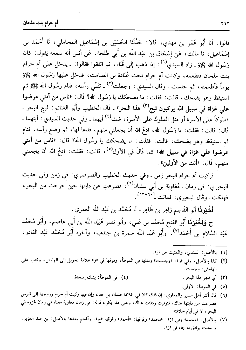 قالوا: أنا أبو عمر بن مهدي قالا حدثنا الحسين بن إسماعيل المحاملي نا أحمد بن إسماعيل نا مالك عن إسحاق بن عبد الله بن أبي طلحة عن أنس أنه سمعه يقول: كان رسول الله (صلى الله عليه وسلم) - زاد السيدي (1) إذا ذهب إلى قباء ثم اتفقوا فقالوا يدخل على أم حرام بنت ملحان فتطعمه وكانت أم حرام تحت عبادة بن الصامت فدخل عليها رسول الله (صلى الله عليه وسلم) يوما فأطعمته ثم جلست وقال السيدي وجعلت (2) تفلي رأسه فنام رسول الله (صلى الله عليه وسلم) ثم استيقظ وهو يضحك قالت فقلت ما يضحكك يا رسول الله قال " ناس من أمتي عرضوا علي غزاة في سبيل الله يركبون ثبج (3) هذا البحر " قال الخطيب وأبو الغنائم ثبج البحر - " ملوكا على الأسرة أو مثل الملوك على الأسرة شك (4) أيهما وفي حديث السيدي أيتهما - قال قالت فقلت يا رسول الله ادع الله أن يجعلني منهم فدعا لها ثم وضع رأسه فنام ثم استيقظ وهو يضحك قالت فقلت ما يضحكك يا رسول الله قال " ناس من أمتي عرضوا علي غزاة في سبيل الله " كما قال في الأول (5) قالت فقلت ادع الله أن يجعلني منهم قال " أنت من الأولين "