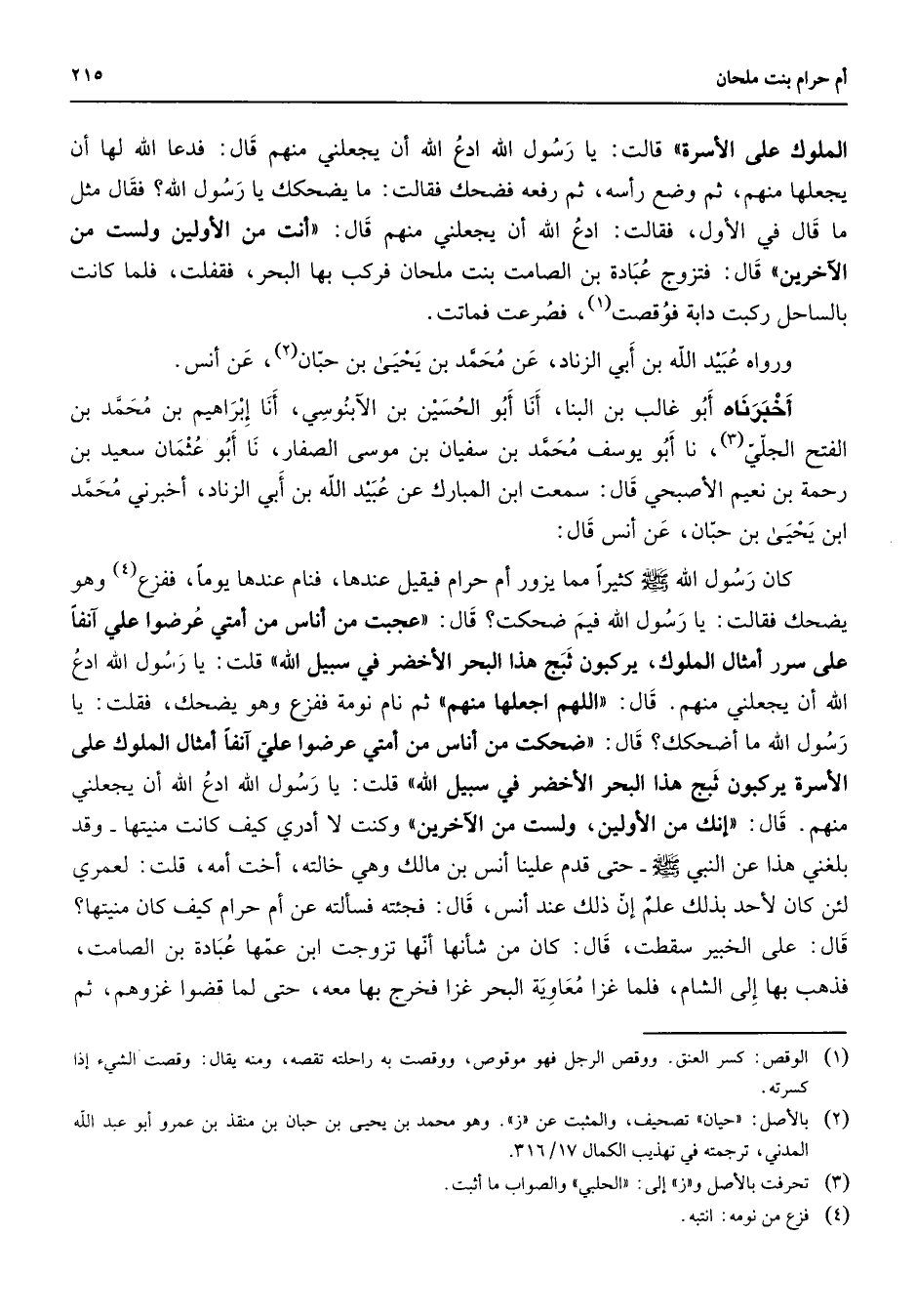 الملوك على الأسرة " قالت: يا رسول الله ادع الله أن يجعلني منهم قال فدعا الله لها أن يجعلها منهم ثم وضع رأسه ثم رفعه فضحك فقالت ما يضحكك يا رسول الله؟ فقال مثل ما قال في الأول فقالت ادع الله أن يجعلني منهم قال " أنت من الأولين ولست من الآخرين " قال فتزوج عبادة بن الصامت بنت ملحان فركب بها البحر فقفلت فلما كانت بالساحل ركبت دابة فوقصت (1) فصرعت فماتت ورواه عبيد الله بن أبي الزناد عن محمد بن يحيى بن حبان (2) عن أنس أخبرناه أبو غالب بن البنا أنا أبو الحسين بن الآبنوسي أنا إبراهيم بن محمد بن الفتح الجلي (3) نا أبو يوسف محمد بن سفيان بن موسى الصفار نا أبو عثمان سعيد بن رحمة بن نعيم الأصبحي قال سمعت ابن المبارك عن عبيد الله بن أبي الزناد أخبرني محمد ابن يحيى بن حبان عن أنس قال: كان رسول الله (صلى الله عليه وسلم) كثيرا مما يزور أم حرام فيقيل عندها فنام عندها يوما ففزع (4) وهو يضحك فقالت يا رسول الله فيم ضحكت قال " عجبت من أناس من أمتي عرضوا علي آنفا على سرر أمثال الملوك يركبون ثبج هذا البحر الأخضر في سبيل الله " قلت يا رسول الله ادع الله أن يجعلني منهم قال " اللهم اجعلها منهم " ثم نام نومة ففزع وهو يضحك فقلت يا رسول الله ما أضحكك قال " ضحكت من أناس من أمتي عرضوا علي آنفا أمثال الملوك على الأسرة يركبون ثبج هذا البحر الأخضر في سبيل الله " قلت يا رسول الله ادع الله أن يجعلني منهم قال " إنك من الأولين ولست من الآخرين " وكنت لا أدري كيف كانت منيتها - وقد بلغني هذا عن النبي (صلى الله عليه وسلم) حتى قدم علينا أنس بن مالك وهي خالته أخت أمه قلت لعمري لئن كان لأحد بذلك علم إن ذلك عند أنس قال فجئته فسألته عن أم حرام كيف كان منيتها؟ قال على الخبير سقطت قال كان من شأنها أنها تزوجت ابن عمها عبادة بن الصامت فذهب بها إلى الشام فلما غزا معاوية البحر غزا فخرج بها معه حتى لما قضوا غزوهم ثم
