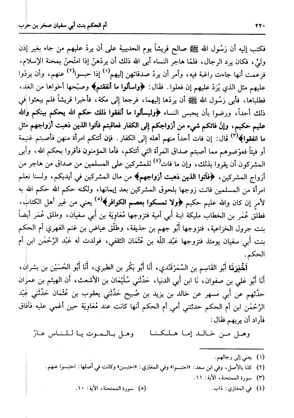 فكتب إليه أن رسول الله (صلى الله عليه وسلم) صالح قريشا يوم الحديبية على أن يرد عليهم من جاء بغير إذن ولي فكان يرد الرجال فلما هاجر النساء أبى الله ذلك أن يردهن إذا امتحن بمحنة الإسلام فزعمت أنها جاءت راغبة فيه وأمر أن يرد صدقاتهن إليهم (1) إذا حبسوا (2) عنهم وأن يردوا عليهم مثل الذي يرد عليهم إن فعلوا فقال " واسألوا ما أنفقتم " وصبحها أخواها من الغد فطلباها فأبى رسول الله (صلى الله عليه وسلم) أن يردها إليهما فرجعا إلى مكة فأخبرا قريشا فلم يبعثوا في ذلك أحدا ورضوا بأن يحبس النساء " وليسألوا ما أنفقوا ذلك حكم الله يحكم بينكم والله عليم حكيم وإن فاتكم شئ من أزواجكم إلى الكفار فعاقبتم فآتوا الذين ذهبت أزواجهم مثل ما أنفقوا " (3) قال إن فات أحدا منهم أهله إلى الكفار فإن أتتكم امرأة منهن فأصبتم غنيمة أو فيئا فعوضوهم مما أصبتم صداق المرأة التي أتتكم فأما المؤمنون فأقروا بحكم الله وأبى المشركون أن يقروا بذلك وإن ما فات (4) للمشركين على المسلمين من صداق من هاجر من أزواج المشركين " فآتوا الذين ذهبت أزواجهم " من مال المشركين في أيديكم ولسنا نعلم امرأة من المسلمين فاتت زوجها بلحوق المشركين بعد إيمانها ولكنه حكم الله حكم الله به لأمر إن كان والله عليم حكيم " ولا تمسكوا بعصم الكوافر " (5) يعني من غير أهل الكتاب فطلق عمر بن الخطاب مليكة ابنة أبي أمية فتزوجها معاوية بن أبي سفيان وطلق عمر أيضا بنت جرول الخزاعية فتزوجها أبو جهم بن حذيفة وطلق عياض بن غنم الفهري أم الحكم بنت أبي سفيان يومئذ فتزوجها عبد الله بن عثمان الثقفي فولدت له عبد الرحمن ابن أم الحكم أخبرنا أبو القاسم بن السمرقندي أنا أبو بكر بن الطبري أنا أبو الحسين بن بشران أنا أبو علي بن صفوان نا ابن أبي الدنيا حدثني سليمان بن الأشعث أن الهيثم بن عمران حدثهم عن أبي مسهر عن خالد بن يزيد بن صبيح حدثني يعقوب بن عثمان حدثني عبد الرحمن بن أم الحكم حدثتني أمي أم الحكم أنها كانت عند معاوية حين أغمي عليه فأفاق فأراد أن يريهم فقال: وهل من خالد إما هلكنا * وهل بالموت يا للناس عار