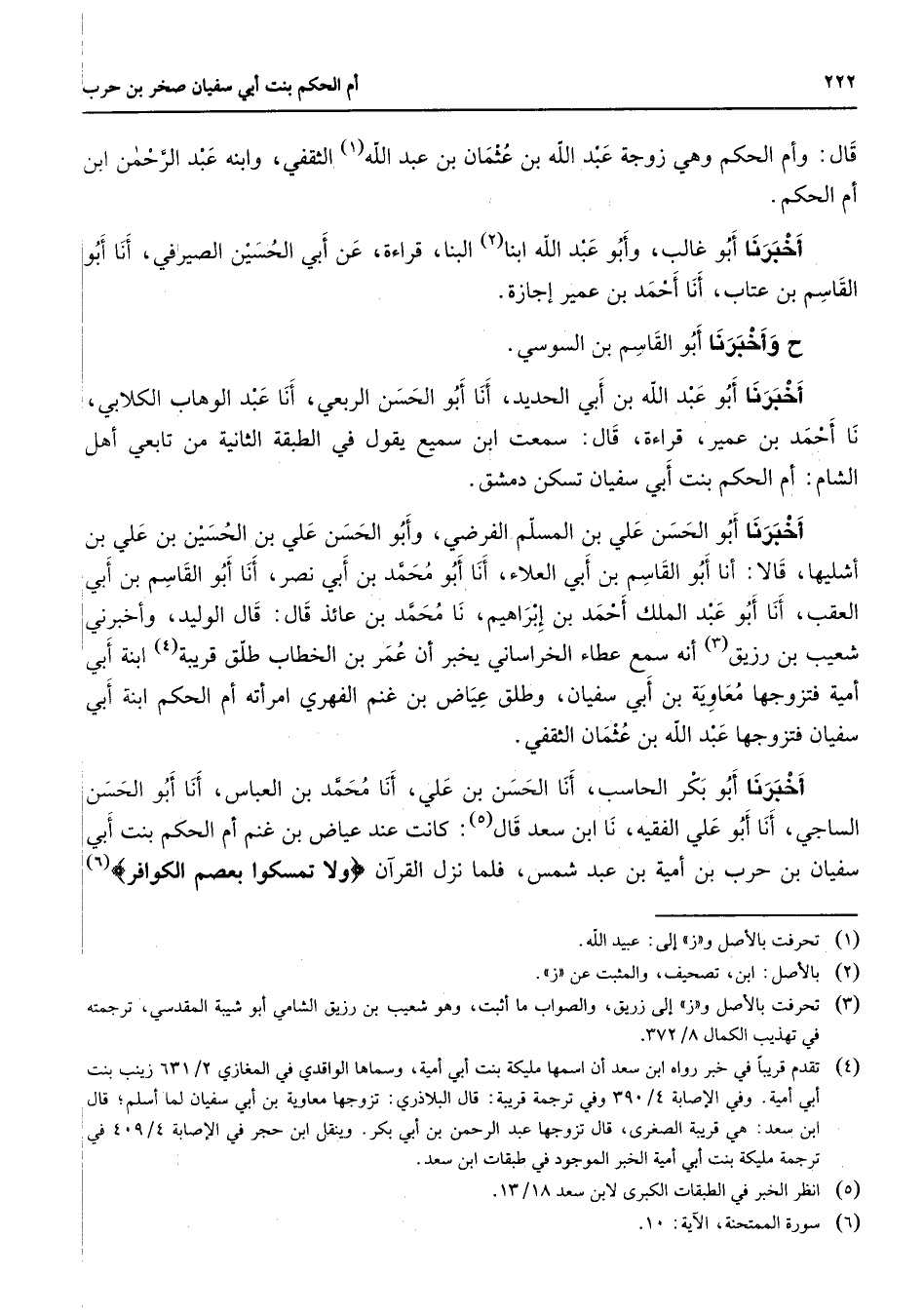 قال: وأم الحكم وهي زوجة عبد الله بن عثمان بن عبد الله (1) الثقفي وابنه عبد الرحمن ابن أم الحكم أخبرنا أبو غالب وأبو عبد الله ابنا (2) البنا قراءة عن أبي الحسن الصيرفي أنا أبو القاسم بن عتاب أنا أحمد بن عمير إجازة ح وأخبرنا أبو القاسم بن السوسي أخبرنا أبو عبد الله بن أبي الحديد أنا أبو الحسن الربعي أنا عبد الوهاب الكلابي نا أحمد بن عمير قراءة قال سمعت ابن سميع يقول في الطبقة الثانية من تابعي أهل الشام أم الحكم بنت أبي سفيان تسكن دمشق أخبرنا أبو الحسن علي بن المسلم الفرضي وأبو الحسن علي بن الحسين بن علي بن أشليها قالا أنا أبو القاسم بن أبي العلاء أنا أبو محمد بن أبي نصر أنا أبو القاسم بن أبي العقب أنا أبو عبد الملك أحمد بن إبراهيم نا محمد بن عائذ قال قال الوليد وأخبرني شعيب بن رزيق (3) أنه سمع عطاء الخراساني يخبر أن عمر بن الخطاب طلق قريبة (4) ابنة أبي أمية فتزوجها معاوية بن أبي سفيان وطلق عياض بن غنم الفهري امرأته أم الحكم ابنة أبي سفيان فتزوجها عبد الله بن عثمان الثقفي أخبرنا أبو بكر الحاسب أنا الحسن بن علي أنا محمد بن العباس أنا أبو الحسن الساجي أنا أبو علي الفقيه نا ابن سعد قال (5) : كانت عند عياض بن غنم أم الحكم بنت أبي سفيان بن حرب بن أمية بن عبد شمس فلما نزل القرآن " ولا تمسكوا بعصم الكوافر " (6)