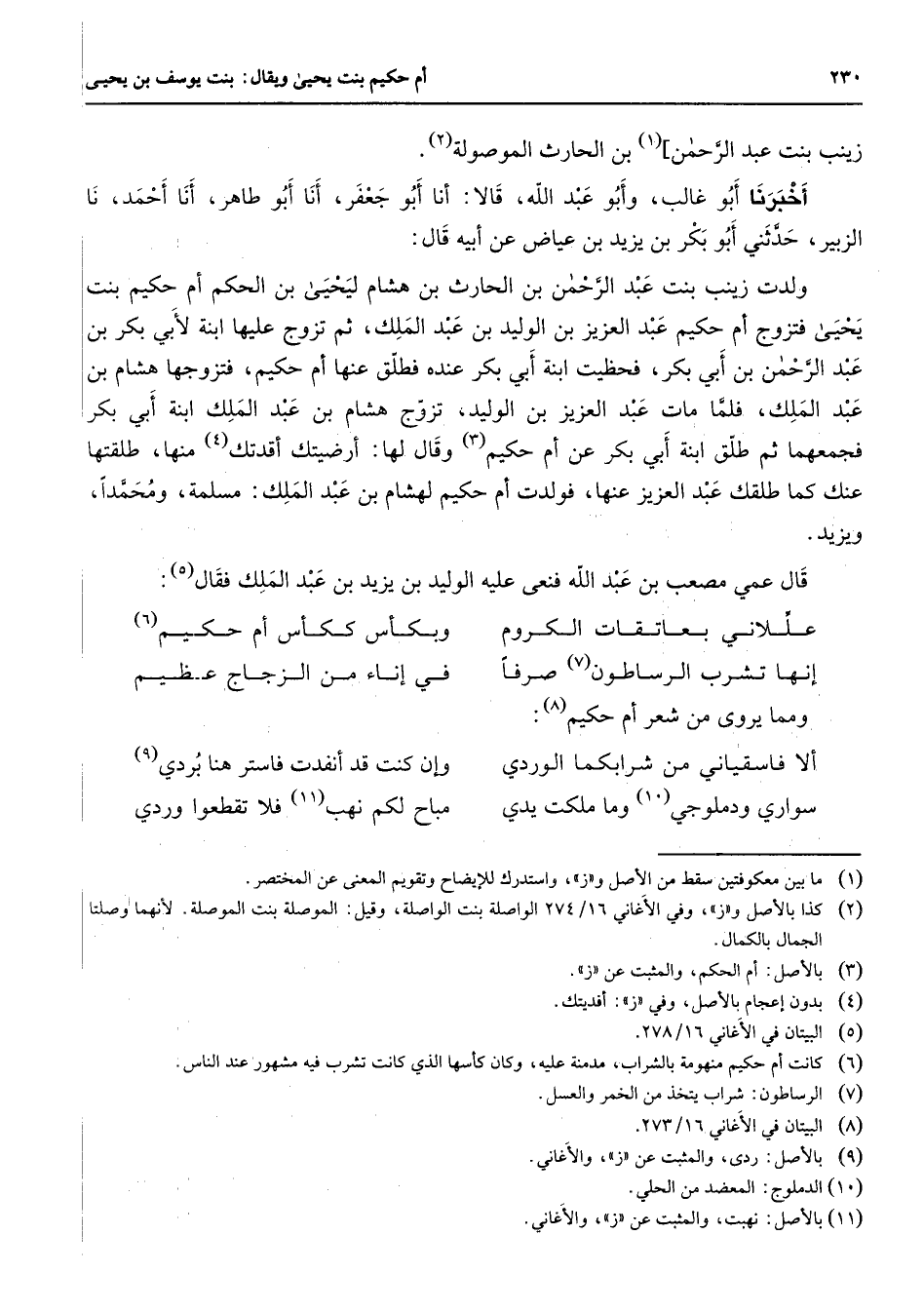 زينب بنت عبد الرحمن] (1) بن الحارث الموصولة (2) أخبرنا أبو غالب وأبو عبد الله قالا أنا أبو جعفر أنا أبو طاهر أنا أحمد نا الزبير حدثني أبو بكر بن يزيد بن عياض عن أبيه قال: ولدت زينب بنت عبد الرحمن بن الحارث بن هشام ليحيى بن الحكم أم حكيم بنت يحيى فتزوج أم حكيم عبد العزيز بن الوليد بن عبد الملك ثم تزوج عليها ابنة لأبي بكر بن عبد الرحمن بن أبي بكر فحظيت ابنة أبي بكر عنده فطلق عنها أم حكيم فتزوجها هشام بن عبد الملك فلما مات عبد العزيز بن الوليد تزوج هشام بن عبد الملك ابنة أبي بكر فجمعهما ثم طلق ابنة أبي بكر عن أم حكيم (3) وقال لها أرضيتك أقدتك (4) منها طلقتها عنك كما طلقك عبد العزيز عنها فولدت أم حكيم لهشام بن عبد الملك مسلمة ومحمدا ويزيد قال عمي مصعب بن عبد الله فنعى عليه الوليد بن يزيد بن عبد الملك فقال (5) : عللاني بعاتقات الكروم * وبكأس ككأس أم حكيم (6) إنها تشرب الرساطون (7) صرفا * في إناء من الزجاج عظيم